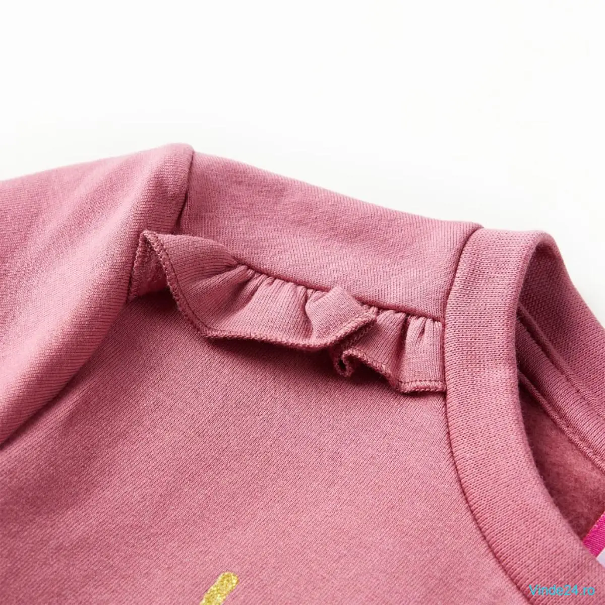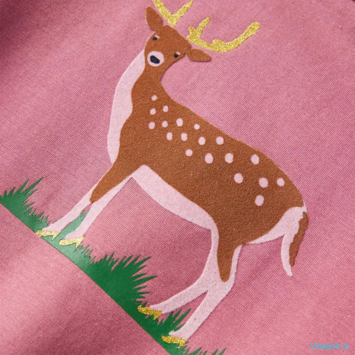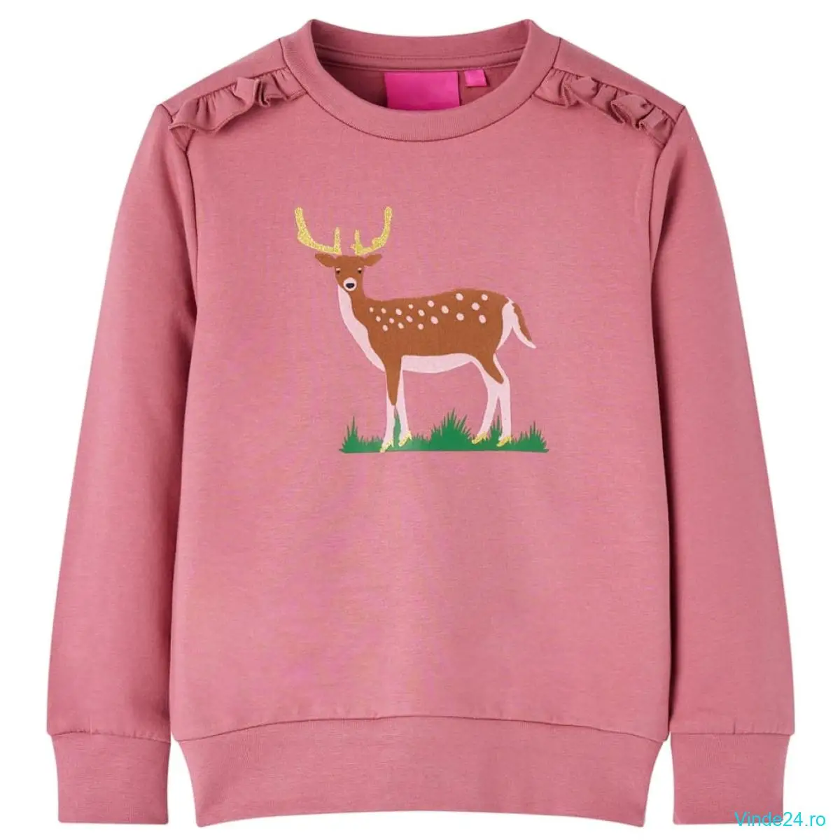 Acest hanorac pentru copii are mâneci lungi, decolteu rotund și margini cu model din elastic împletit la manșete, în jurul gâtului și în partea inferioară. Bluza pentru copii prezintă un cerb frumos imprimat și detalii cu volane. Bluzonul pentru copii este confecționată din 95% bumbac și 5% elastan, pentru confort și respirabilitate. Căptușeala moale din fleece oferă un plus de căldură.