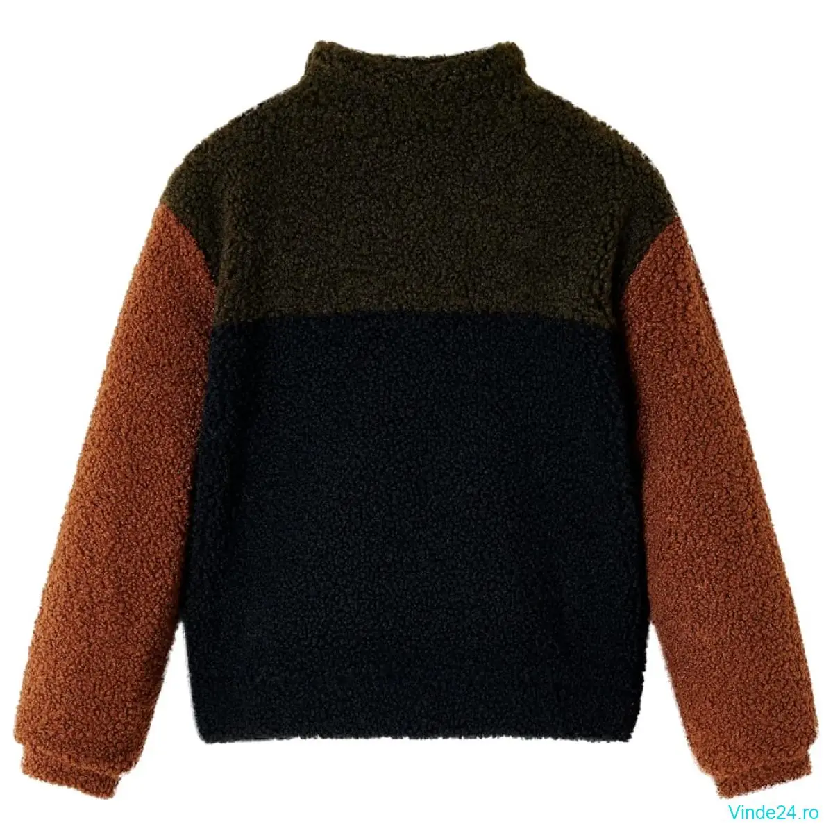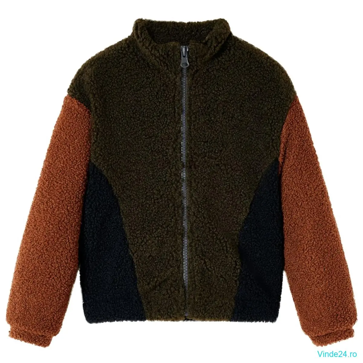 Această jachetă pentru copii are mâneci lungi, guler înalt tip bentiță și se închide complet cu fermoar. Jacheta pentru copii este realizată cu un mozaic de culori distractiv, incluzând kaki, camel și negru. Jacheta pentru copii este realizată din poliester 100%, ceea ce o face călduroasă și confortabilă.