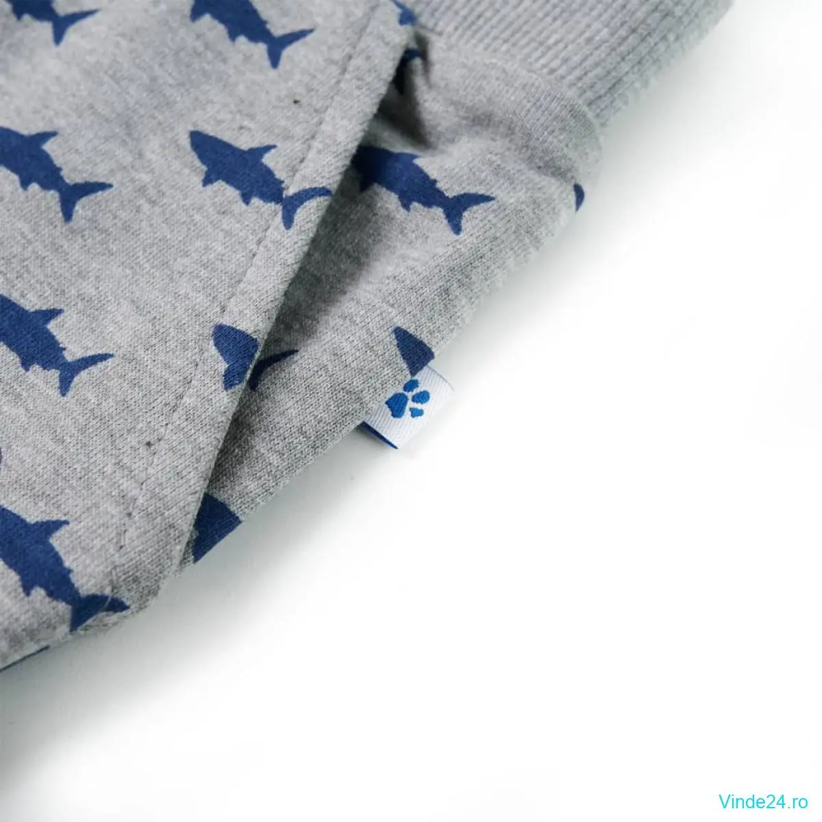 Pantalonii scurți pentru copii prezintă rechini peste tot. Această pereche de pantaloni scurți pentru copii are o betelie elastică în talie, un buzunar fals la spate, două buzunare laterale și tiv cusut răsucit. Pantalonii scurți pentru copii sunt confecționați din material moale care include 90% bumbac și 10% viscoză, pentru confort și respirabilitate.