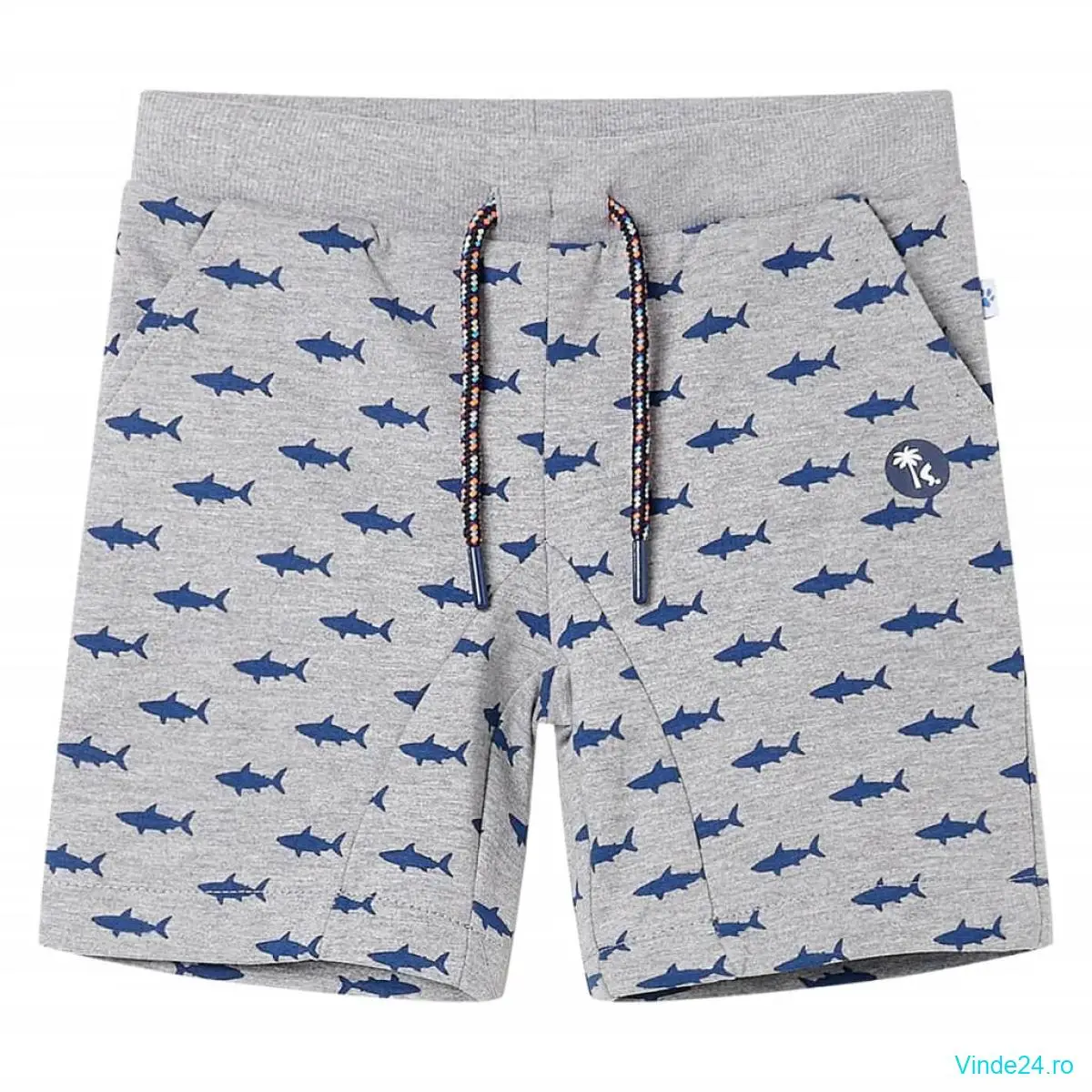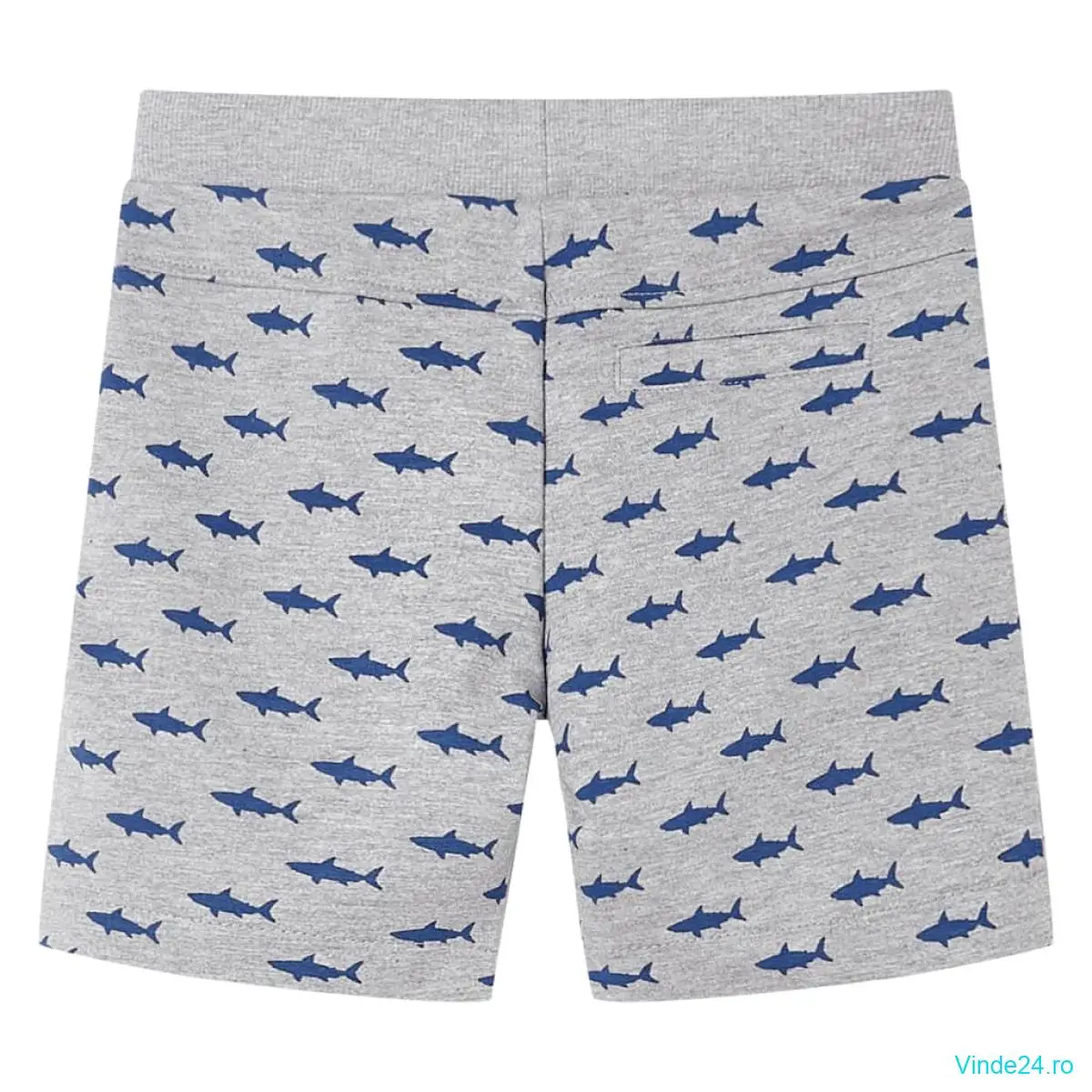 Pantalonii scurți pentru copii prezintă rechini peste tot. Această pereche de pantaloni scurți pentru copii are o betelie elastică în talie, un buzunar fals la spate, două buzunare laterale și tiv cusut răsucit. Pantalonii scurți pentru copii sunt confecționați din material moale care include 90% bumbac și 10% viscoză, pentru confort și respirabilitate.