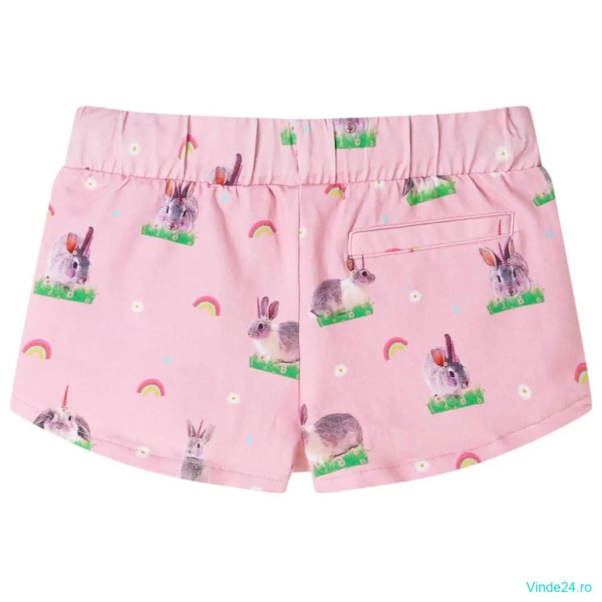 Această pereche de pantaloni scurți pentru copii are o betelie elastică în talie și două buzunare inserate. Pantalonii scurți pentru copii sunt imprimați cu iepuri, curcubeie și iarbă peste tot. Pantalonii scurți pentru copii sunt confecționați din material moale care include 92% bumbac și 8% elastan, pentru confort și respirabilitate.