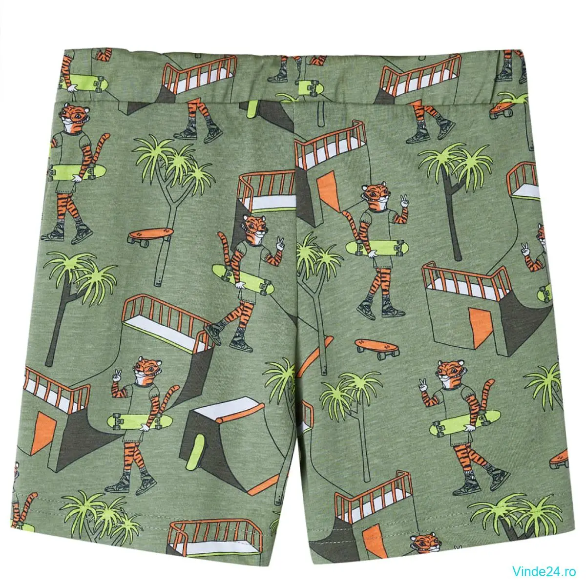 Această pereche de pijamale pentru copii cu mâneci scurte are un decolteu rotund, talie elastică și o croială obișnuită. Această pijama pentru copii are un imprimeu cu tigrii și copaci. Hainele de relaxare pentru copii sunt realizate din material moale, 100% bumbac, pentru un plus de confort și respirabilitate.