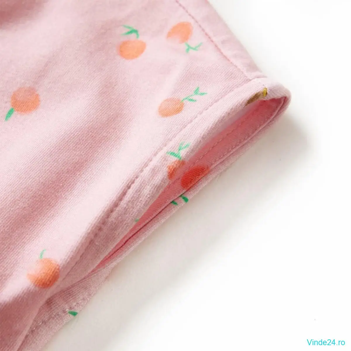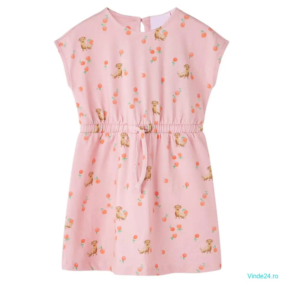 Această rochie pentru copii are un decolteu rotund, mâneci tip șapcă, o talie elastică cu șnur reglabil și se închide cu un nasture la gât. Această rochie pentru copii are un imprimeu cu cățeluși și fructe, peste tot. Rochia scurtă pentru copii este confecționată dintr-un material moale care include 94% bumbac și 6% elastan, pentru confort și respirabilitate.