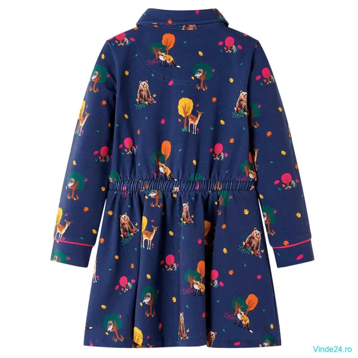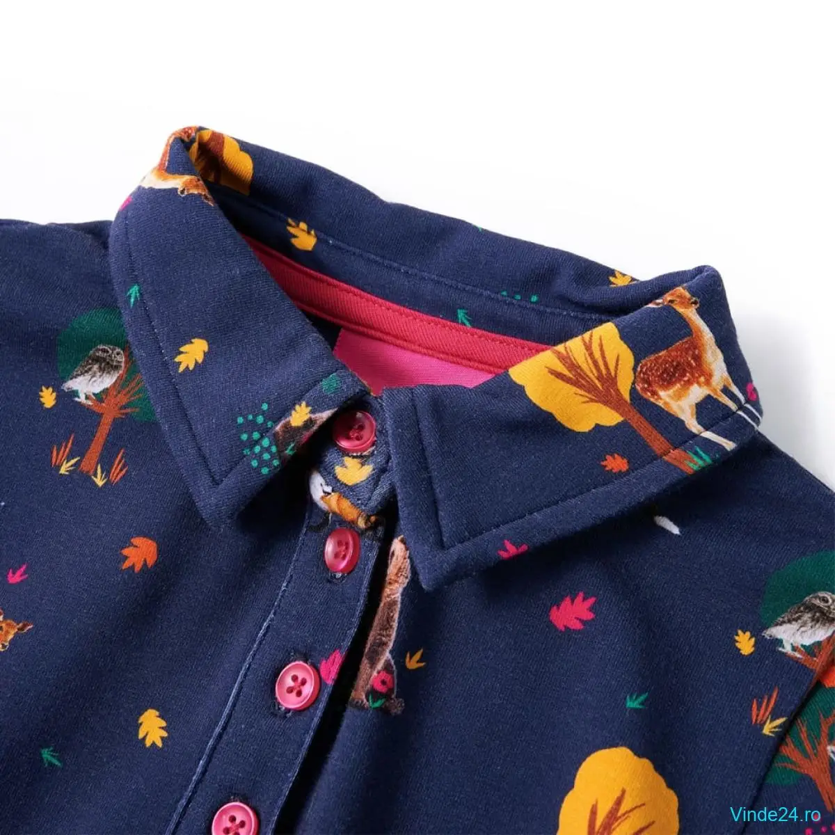 Această rochie pentru copii are mâneci lungi, guler întors și talie elastică cu șnur reglabil. Rochia pentru copii este imprimată cu modele de animale precum vulpi, urși și căprioare. Această rochie cu nasturi este confecționată dintr-un material moale care include 92% bumbac și 8% elastan, pentru confort și respirabilitate.