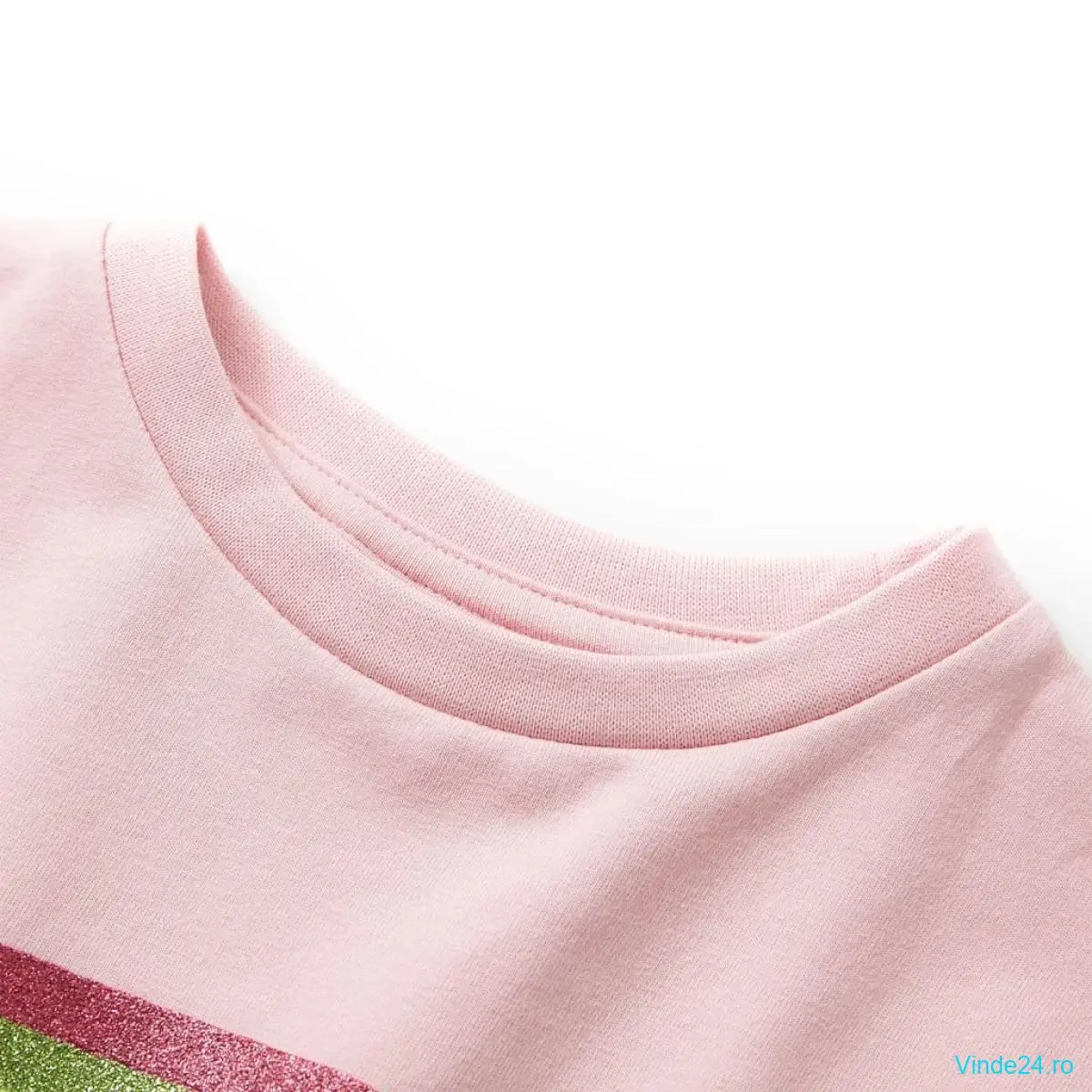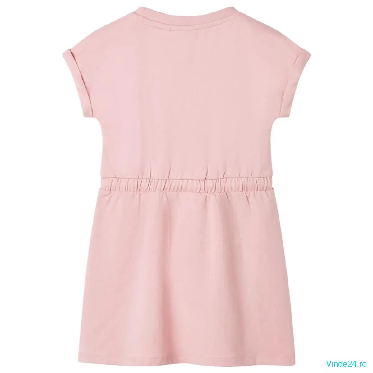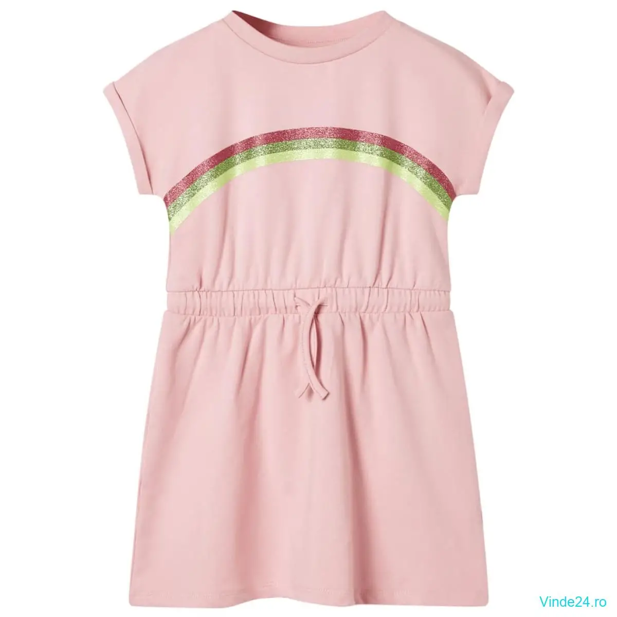 Această rochie pentru copii are un decolteu rotund, mâneci tip șapcă și o talie elastică cu șnur reglabil. Această rochie pentru copii prezintă trei linii colorate curbate. Rochia scurtă pentru copii este confecționată dintr-un material moale care include 95% bumbac și 5% elastan, pentru confort și respirabilitate.