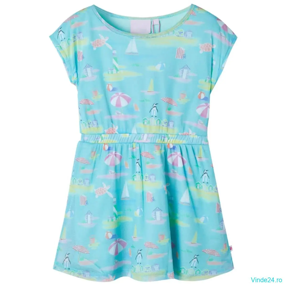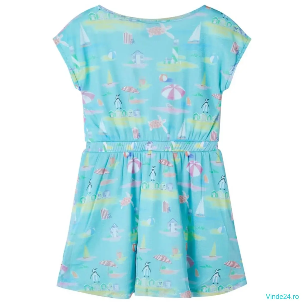 Această rochie pentru copii are un decolteu rotund, mâneci tip șapcă și o talie elastică. Această rochie pentru copii are un strat din plasă imprimat complet cu peisaje de pe plajă. Rochia scurtă pentru copii este confecționată dintr-un material moale care include poliester, bumbac și elastan, pentru confort și respirabilitate.
