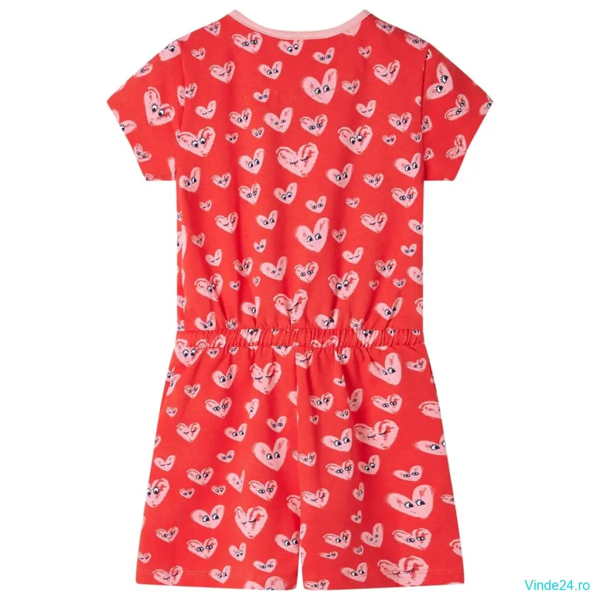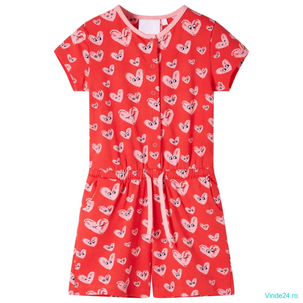 Această salopetă pentru copii are mâneci scurte, decolteu rotund, talie cu șnur, 2 buzunare frontale și se închide cu un rând de capse, prin apăsare. Această salopetă pentru copii are imprimate inimioare minunate din desene animate, peste tot. Salopeta pentru copii este confecționată dintr-un material moale care include 95% bumbac și 5% elastan, pentru confort și respirabilitate.