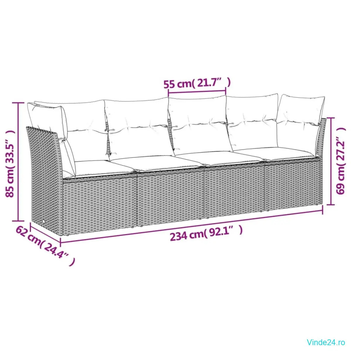 • Dimensiuni totale canapea: 234 x 62 x 69 cm (l x ad. x î)