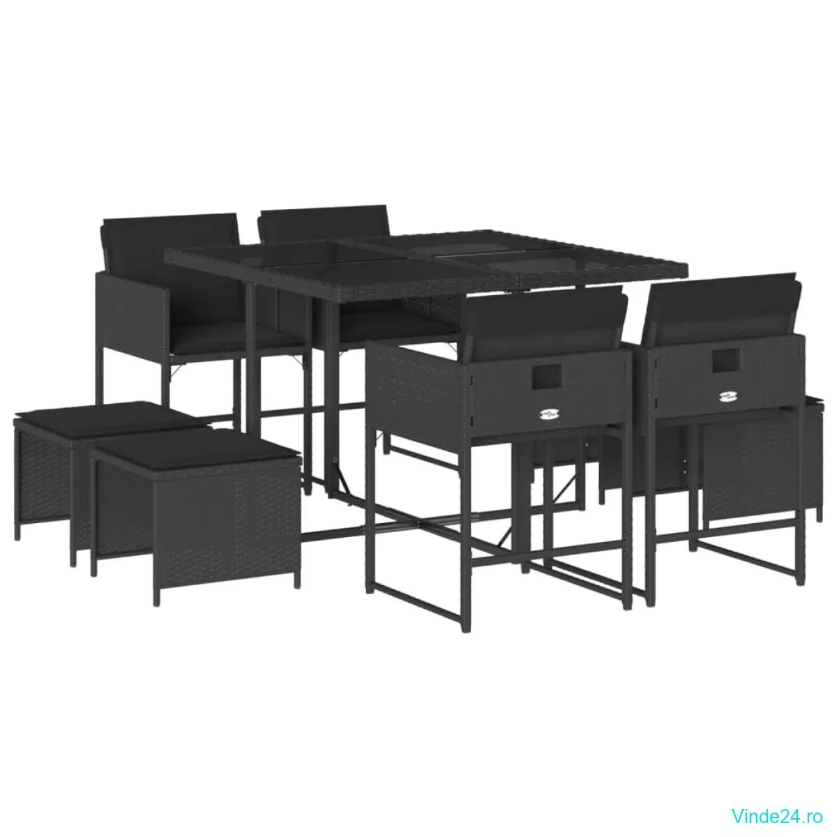 Set mobilier de grădină cu perne, 9 piese, negru, poliratan