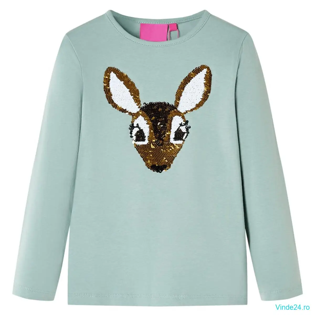 Acest tricou pentru copii are mâneci lungi, decolteu rotund și croială dreaptă. Motivul cu o căprioară brodată cu paiete reversibile aduce o notă de magie în partea din față. Tricoul pentru copii cu mânecă lungă este confecționat din material moale, cu 95% bumbac si 5% elastan, pentru un plus de confort și respirabilitate.