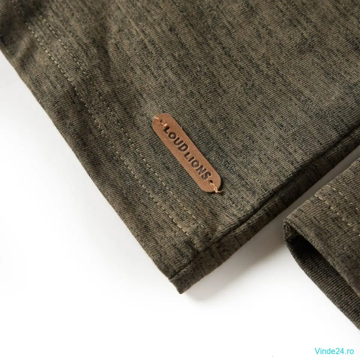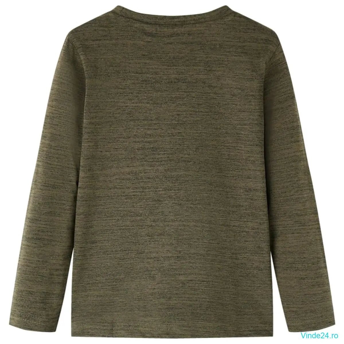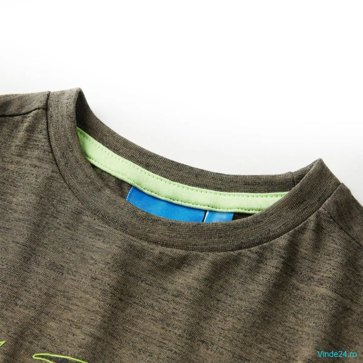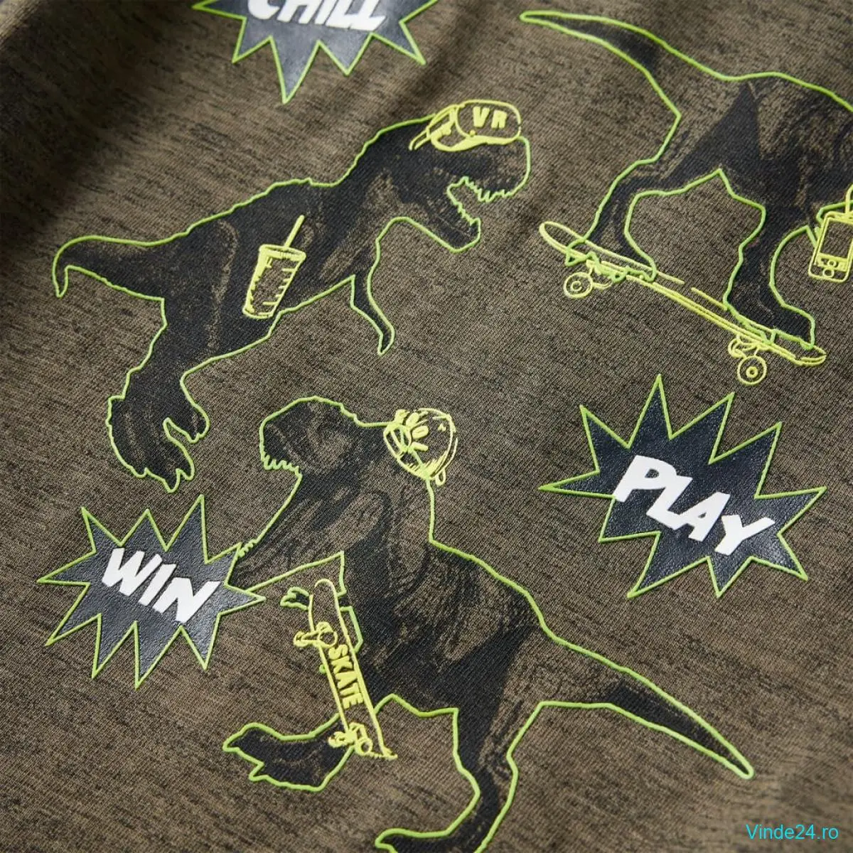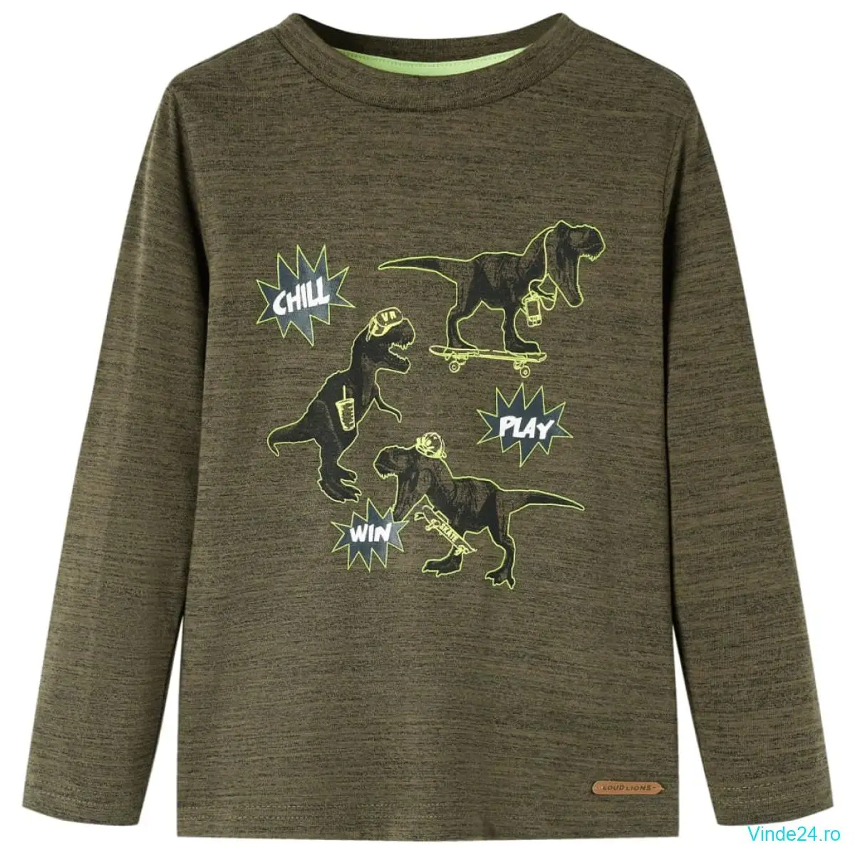 Acest tricou pentru copii are mâneci lungi, decolteu rotund și model drept. Acest tricou kaki închis melange prezintă dinozauri. Tricoul pentru copii cu mânecă lungă este confecționat din material moale cu 80% bumbac și 20% poliester, pentru un plus de confort și respirabilitate.