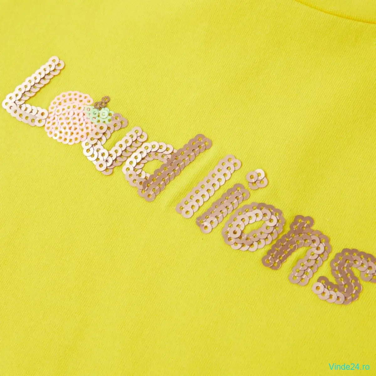 Acest tricou pentru copii are mâneci scurte tip șapcă, decolteu rotund și croială dreaptă. Acest tricou pentru copii are litere cu paiete. Tricoul pentru copii cu mâneci tip șapcă este confecționat din material moale care include 95% bumbac și 5% elastan, pentru confort și respirabilitate.