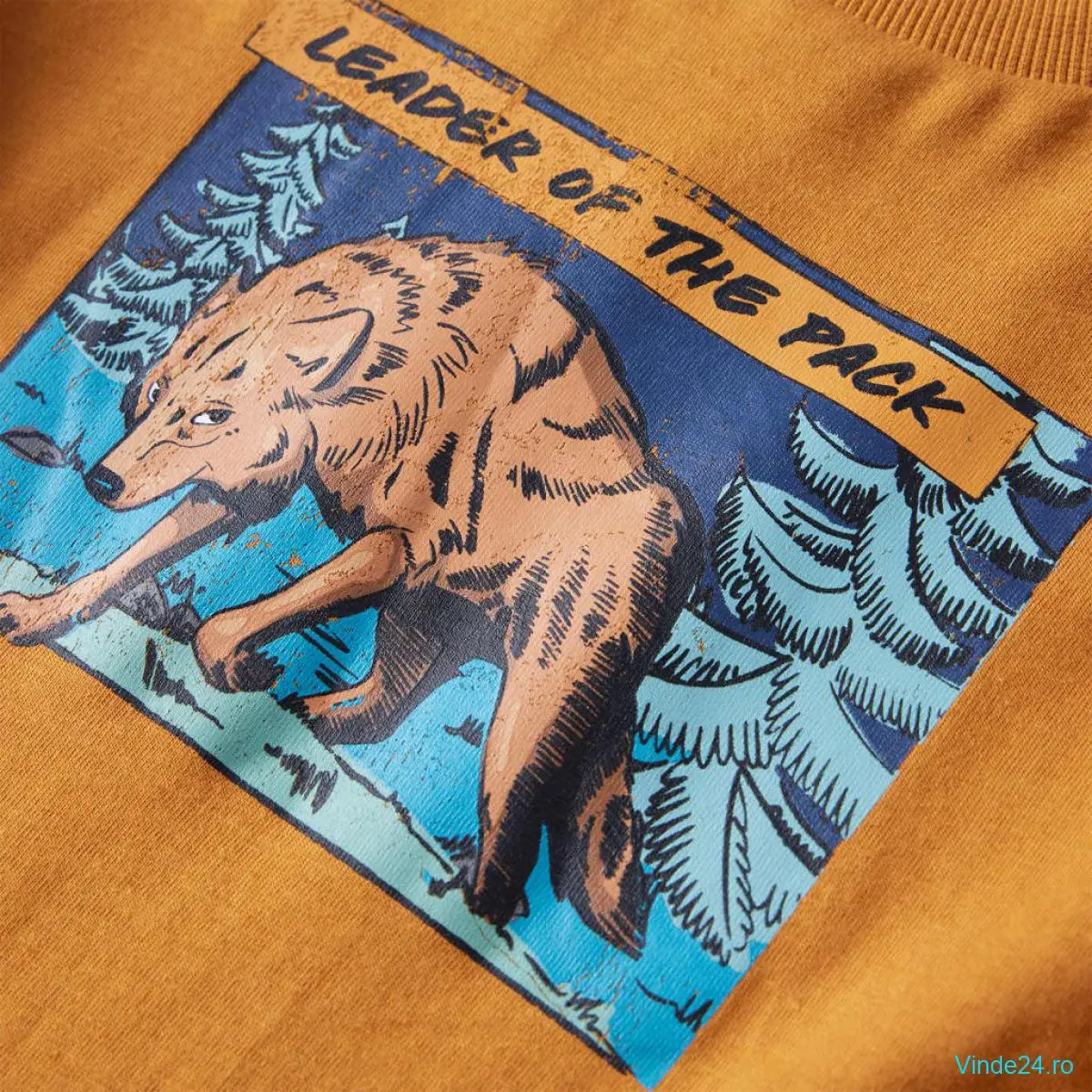 Acest tricou pentru copii are mâneci lungi, decolteu rotund și model drept. Acest tricou ocru închis prezintă un lup în pădure. Tricoul pentru copii cu mânecă lungă este confecționat din bumbac 100%, care este tratat cu silicon și enzime prin spălare, pentru o atingere moale și confortabilă.