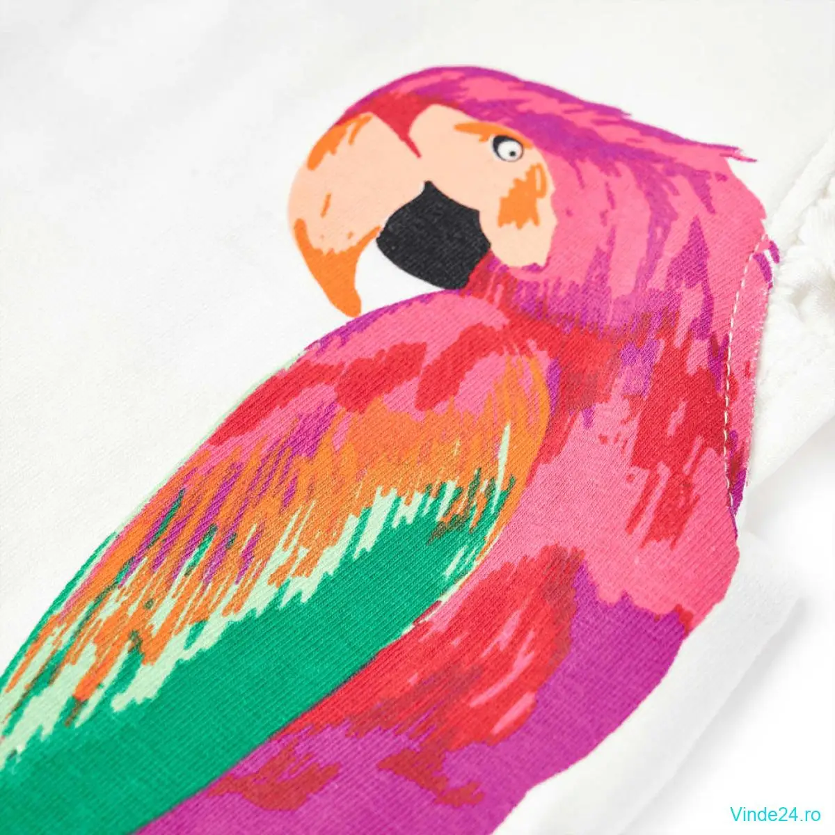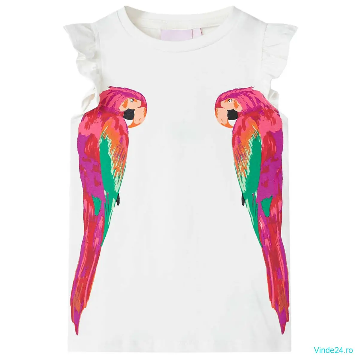 Acest tricou pentru copii fără mâneci are un decolteu rotund, volane frumoase pe umeri și croială dreaptă. Tricoul pentru copii prezintă papagali drăguți. Tricoul pentru copii este confecționat din bumbac și elastan, pentru o atingere moale și confortabilă.