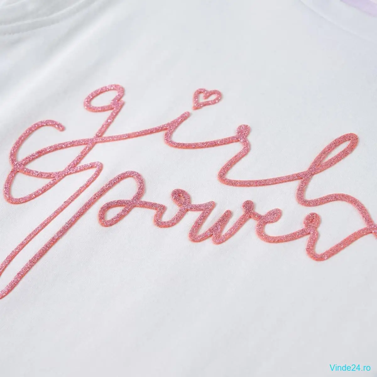 Acest tricou pentru copii are mâneci scurte, decolteu rotund și volane frumoase. Volanele frumoase și imprimeul cu sclipici fac tricoul pentru copii să arate elegant și frumos. Tricoul pentru copii cu mânecă lungă este confecționat din material moale cu 95% bumbac și 5% elastan, oferind un plus de confort și elasticitate.