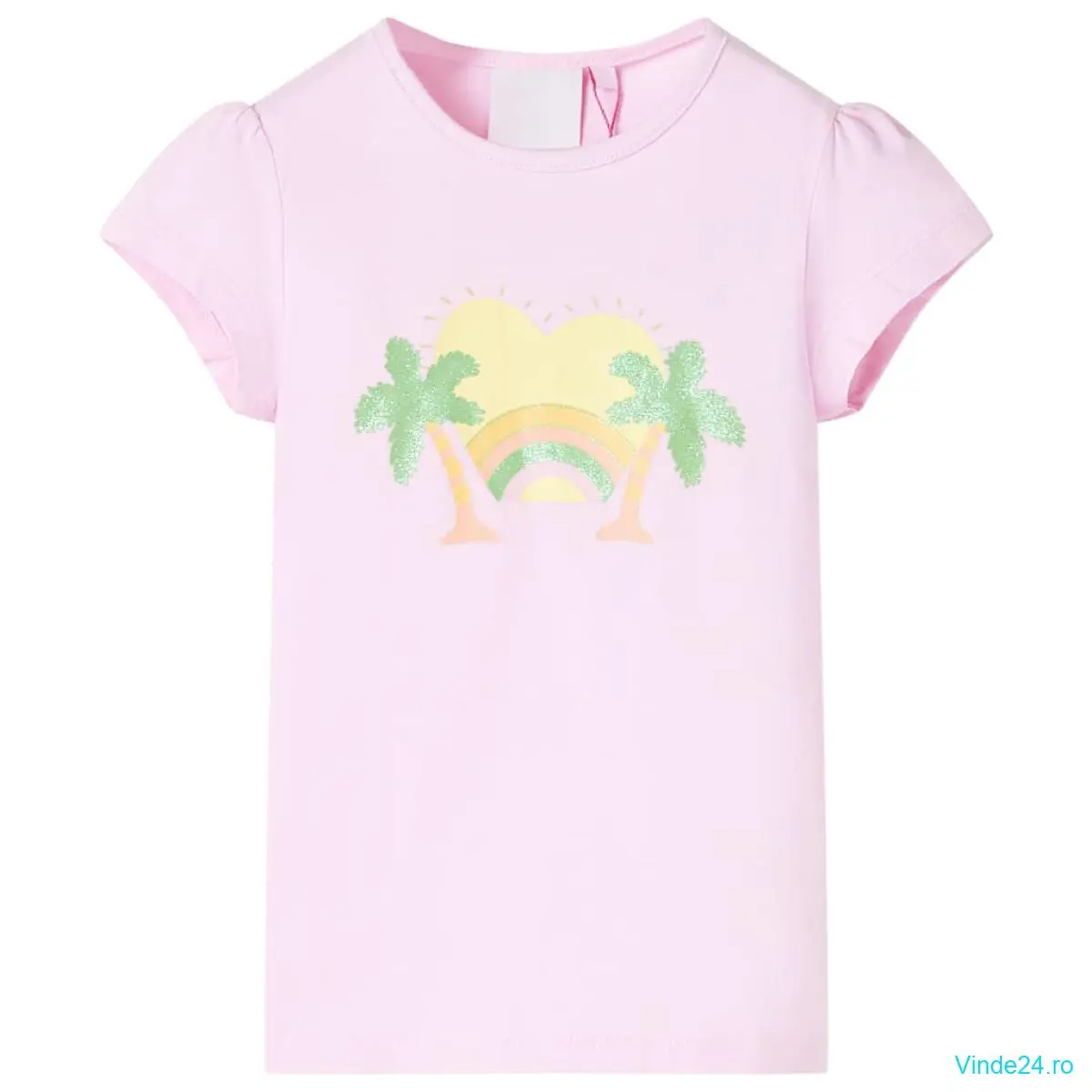 Acest tricou pentru copii are mâneci scurte, decolteu rotund și croială dreaptă. Acest tricou este imprimat cu un curcubeu și palmieri, pe piept. Tricoul pentru copii cu mânecă scurtă este confecționat din 95% bumbac și 5% elastan, pentru confort și respirabilitate.