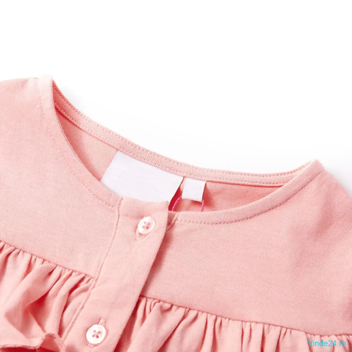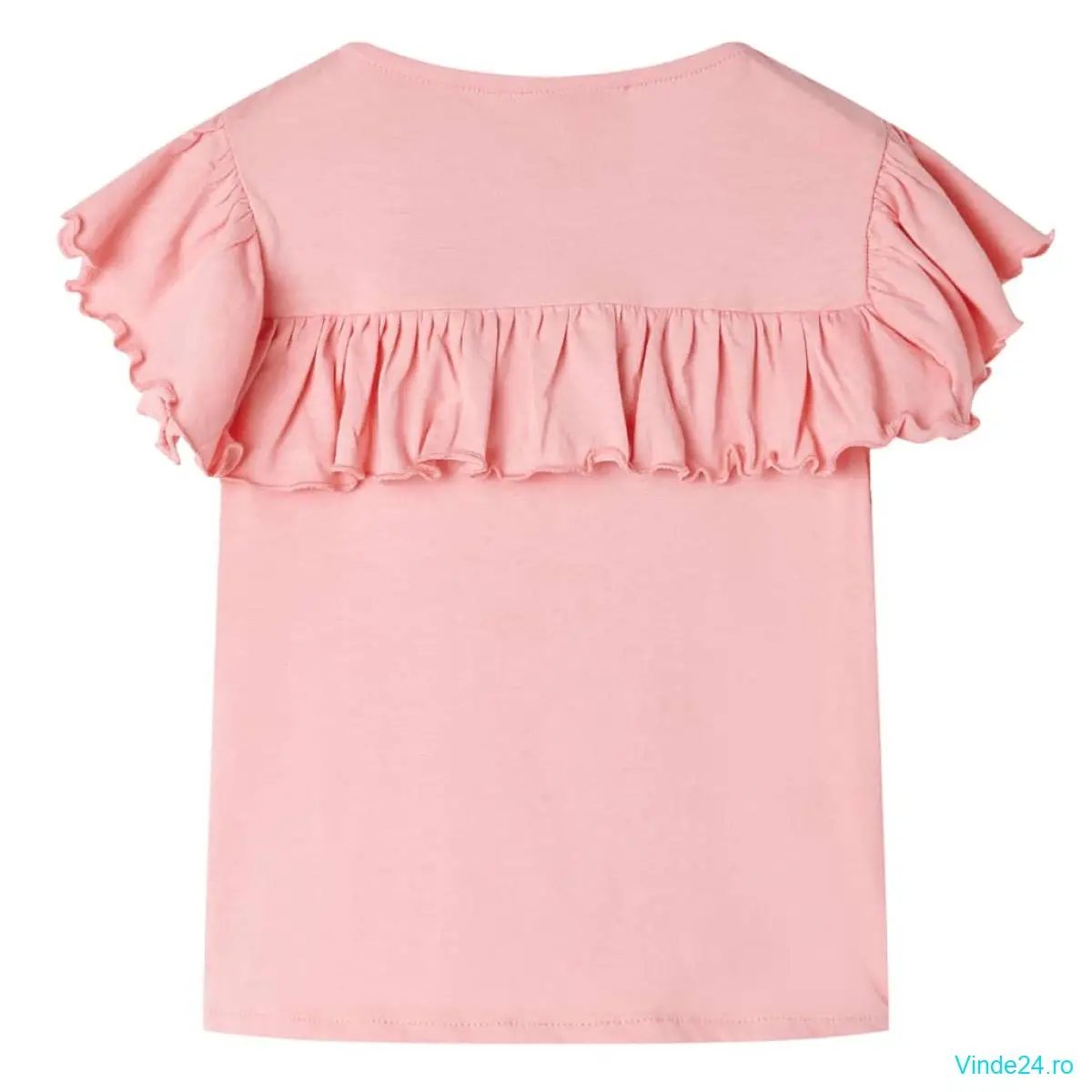 Acest tricou pentru copii are mâneci scurte, decolteu rotund și se închide cu un rând de nasturi în față. Tricoul pentru copii are volane frumoase pe umeri și pe piept. Tricoul pentru copii este confecționat din bumbac, pentru o atingere moale și confortabilă.