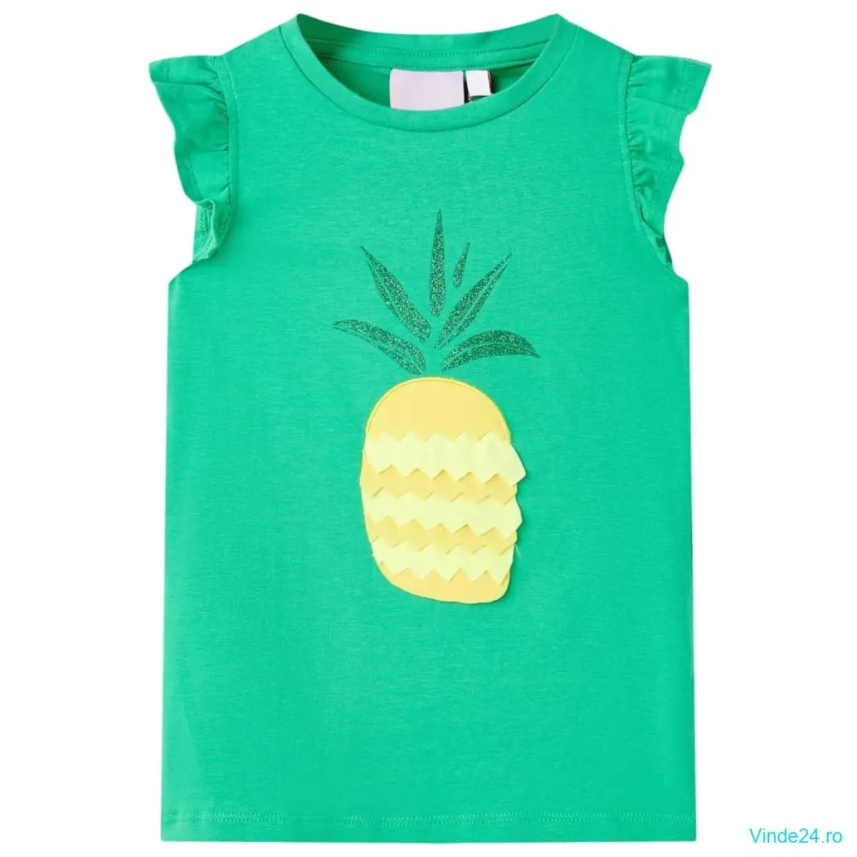Acest tricou pentru copii fără mâneci are un decolteu rotund și o croială dreaptă. Tricoul pentru copii prezintă un ananas pe partea din față. Tricoul pentru copii este confecționat din bumbac și elastan, pentru o atingere moale și confortabilă.