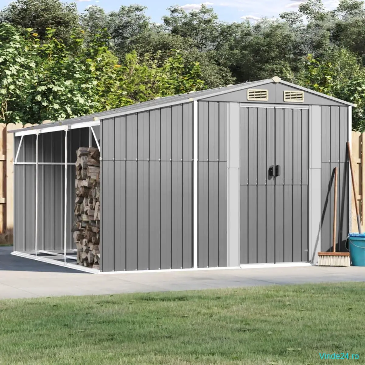 - Spațiu amplu de depozitare: Acest șopron metalic cu suport pentru lemne de foc oferă spațiu amplu pentru a depozita lemne de foc, unelte de grădină, mobilier, echipamente și multe altele.
