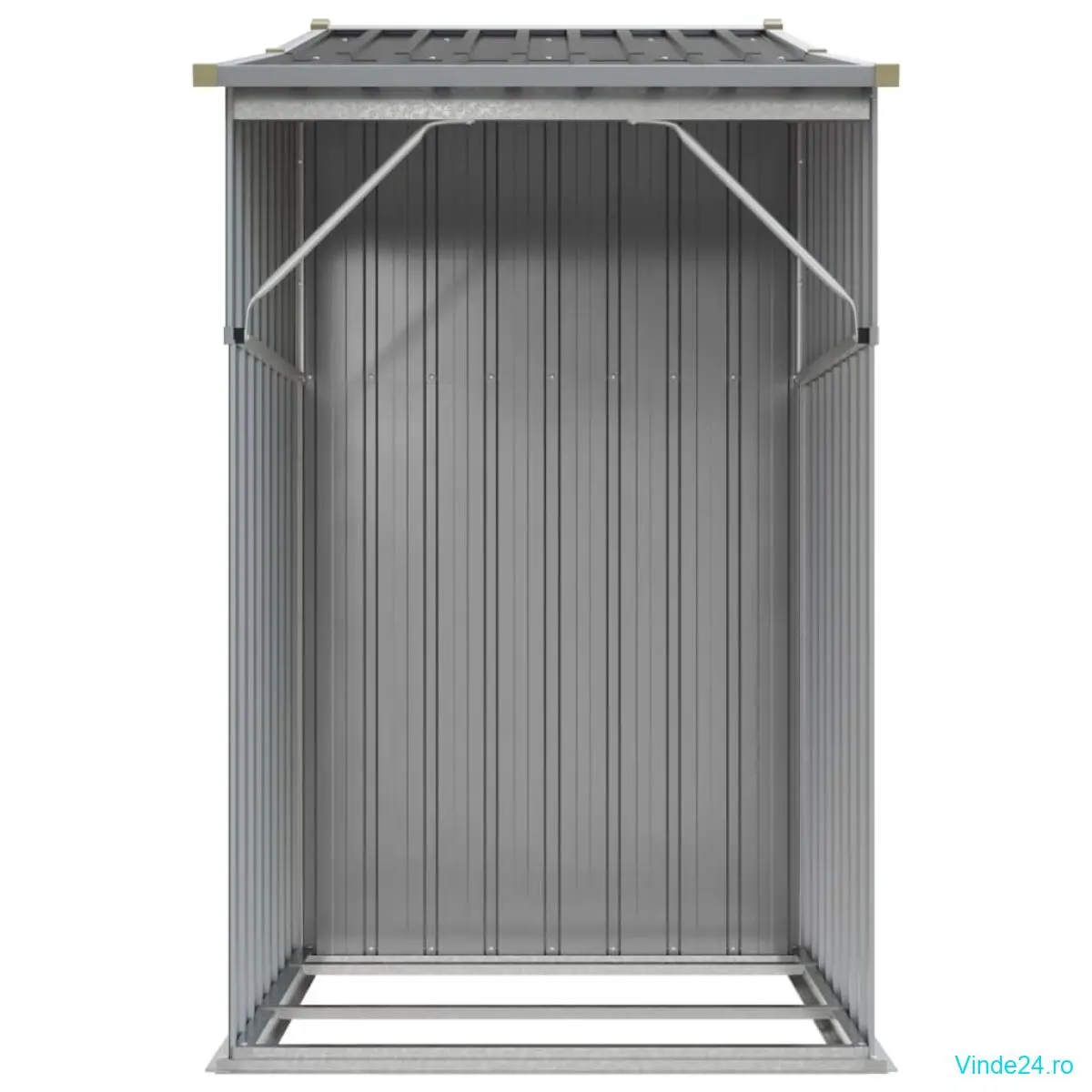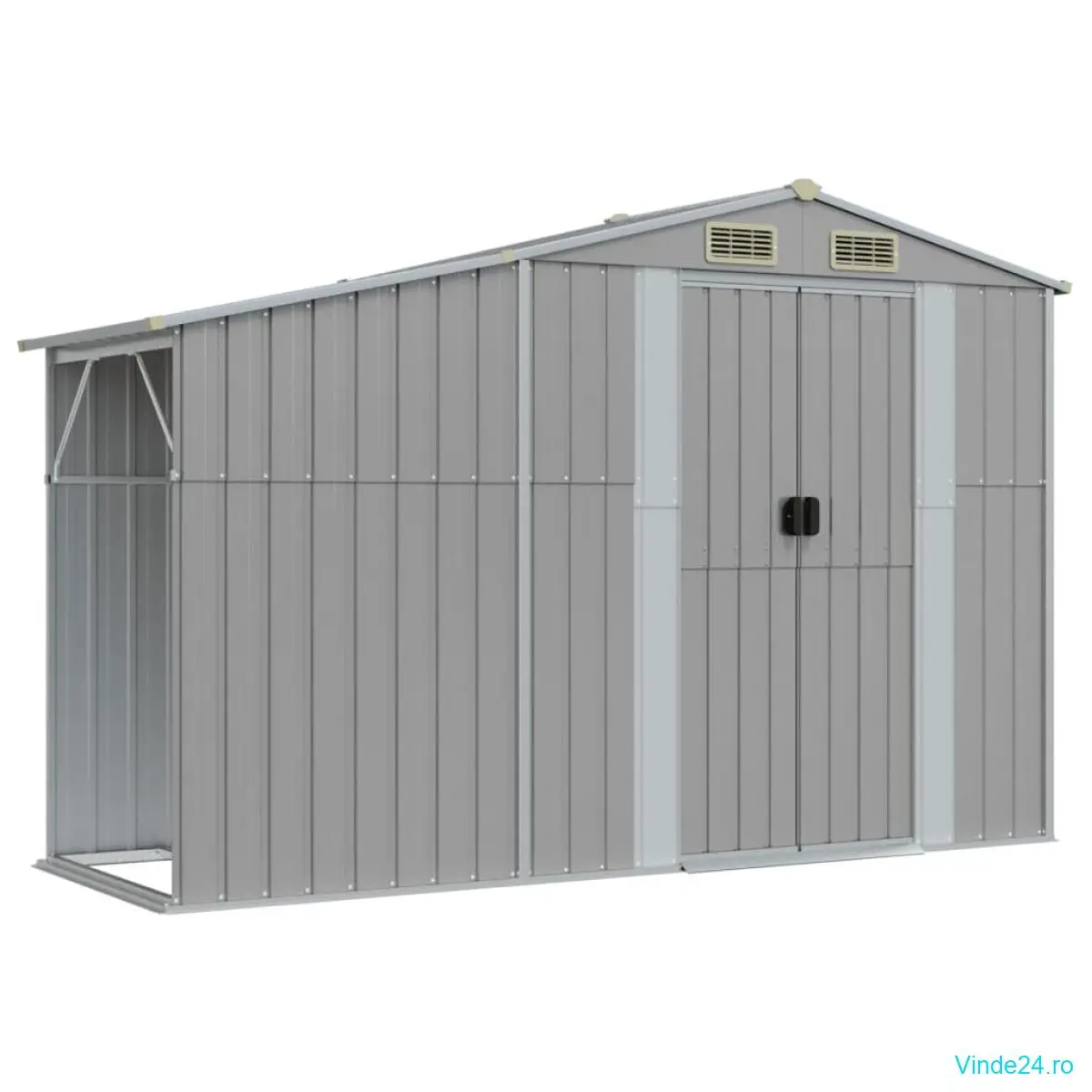 - Spațiu amplu de depozitare: Această magazie metalică, formată dintr-un suport pentru lemne de foc și o magazie mare, oferă spațiu amplu pentru organizarea uneltelor de grădină.