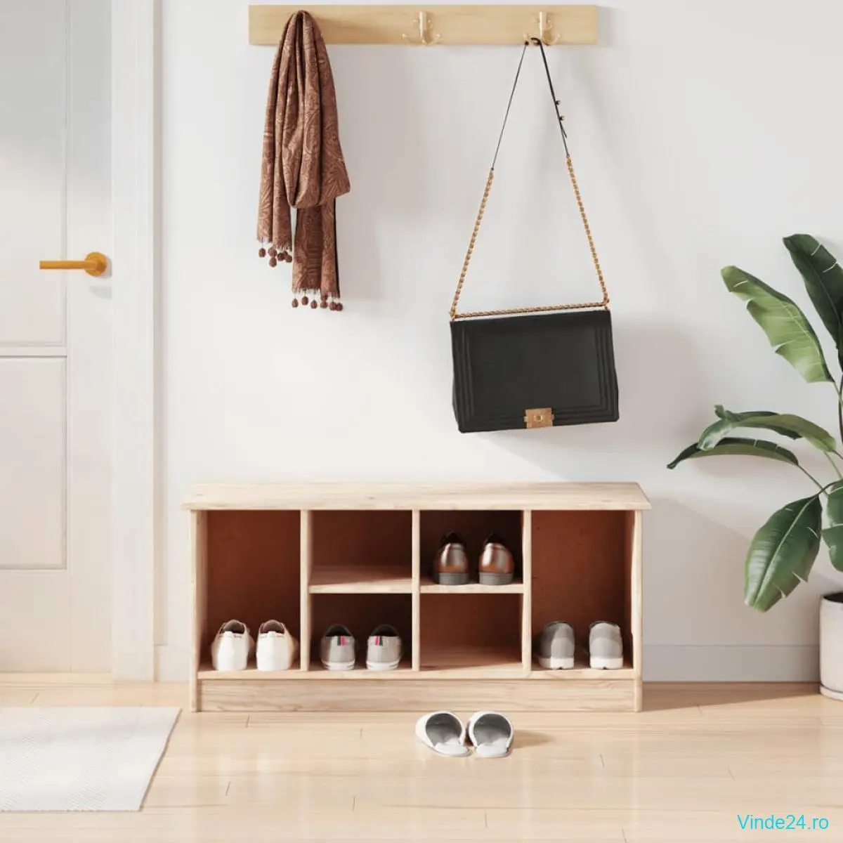- Suprafață netratată: Deoarece dulapul de pantofi este realizat din lemn masiv de pin nefinisat, îi puteți păstra culoarea naturală ori o puteți vopsi sau lăcui după preferințe.