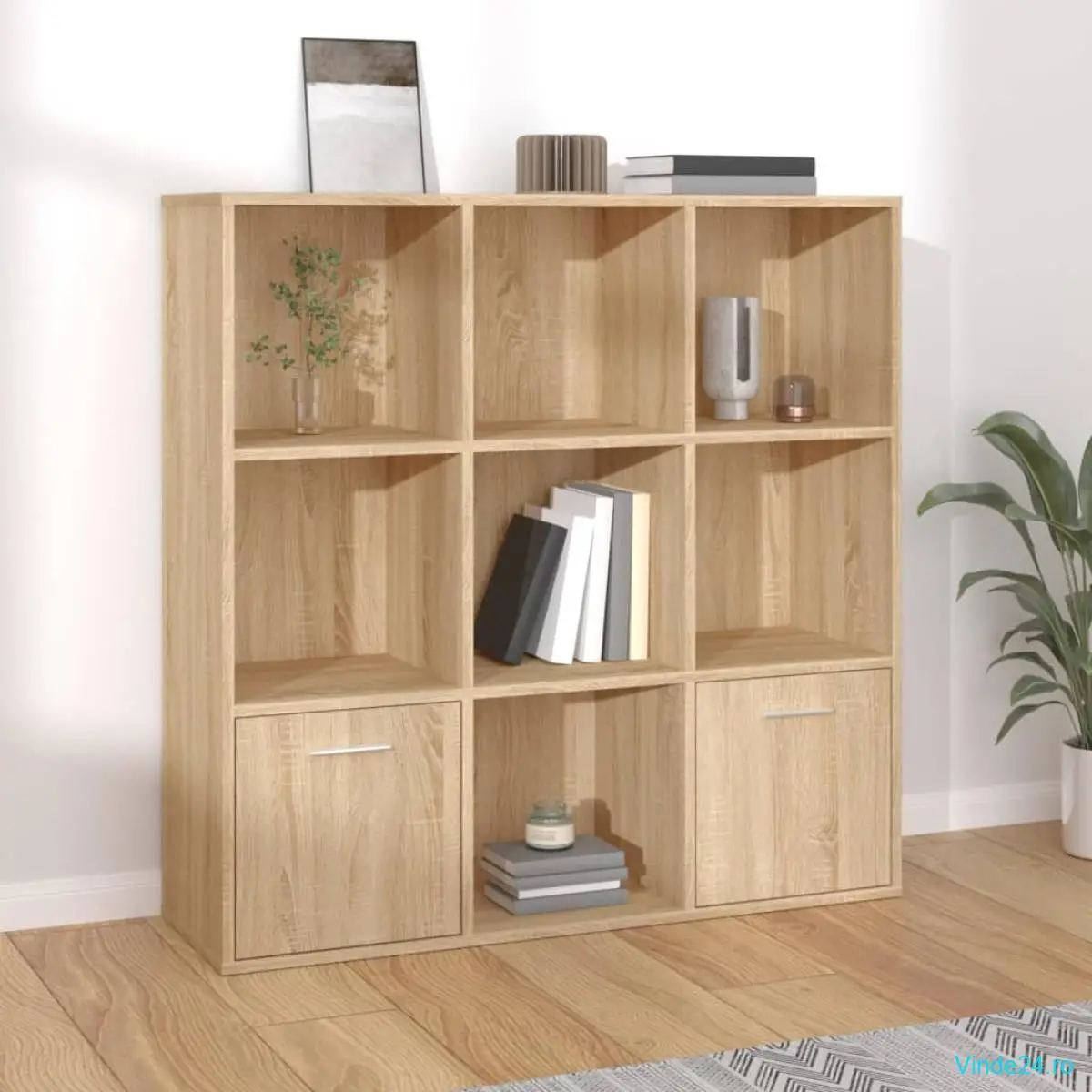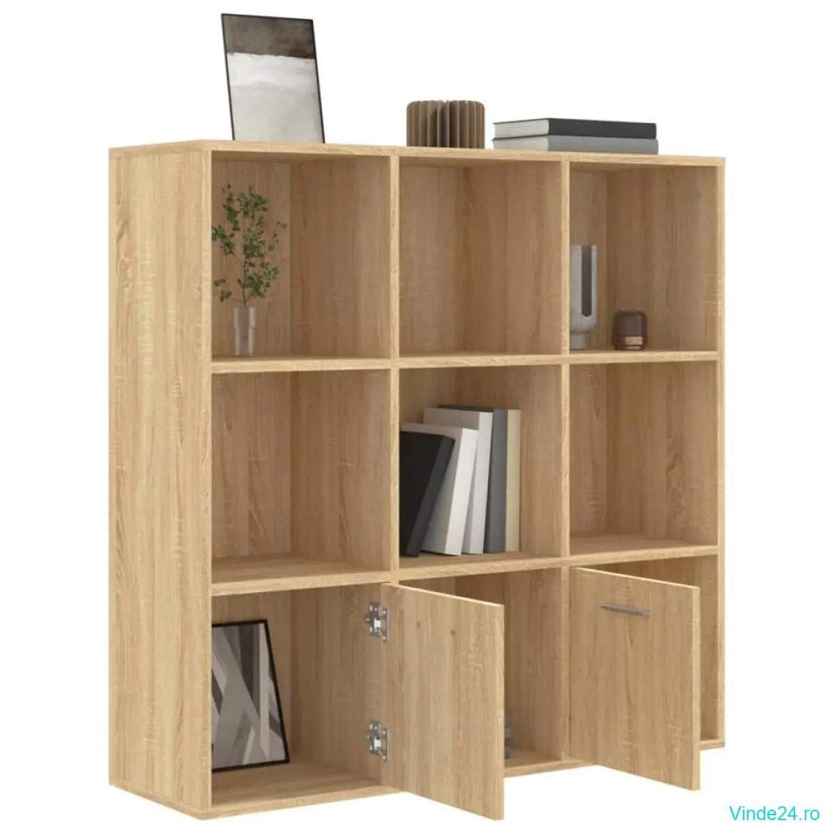 Dulapul este realizat din lemn compozit de calitate, care îi asigură rezistența și durabilitatea. Fiind proiectată cu 7 cuburi deschise și 2 uși, biblioteca oferă un spațiu de depozitare generos pentru a vă păstra revistele, cărțile, DVD-urile, dispozitivele multimedia și obiectele decorative, bine organizate și la îndemână.