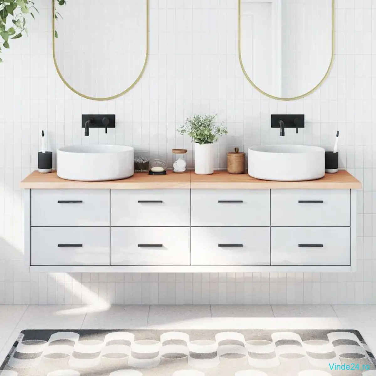 • Suprafață netratată: Deoarece blatul de baie este realizat din lemn masiv de stejar fără finisaj, îi puteți păstra culoarea naturală, dar îl puteți și vopsi sau lăcui după preferințe.
