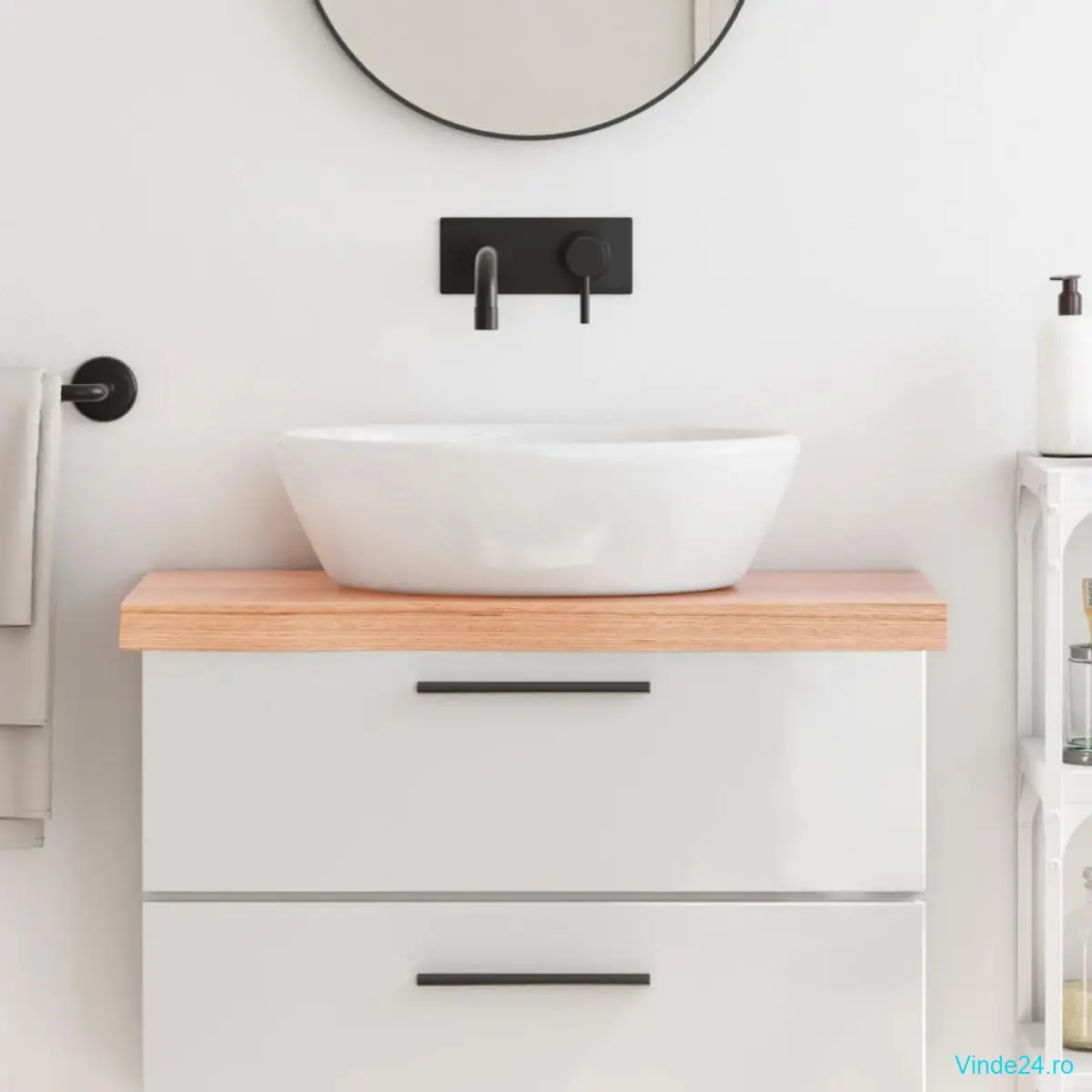 - Construcție durabilă: Acest blat de baie este realizat din lemn masiv de stejar, care este un material natural frumos. Lemnul de stejar are o culoare maro mediu și granulație densă, contribuind la aspectul său unic.