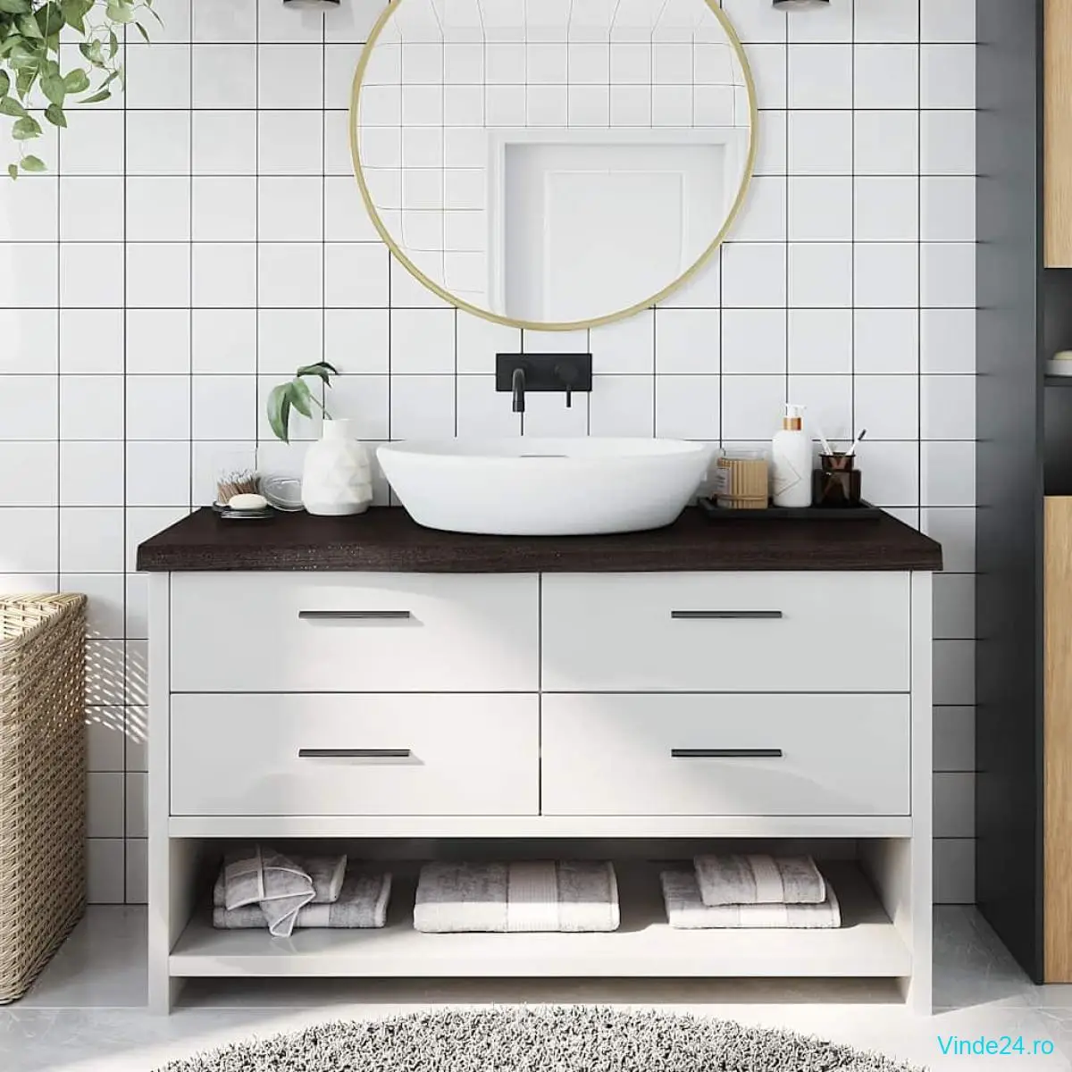 - Suprafață tratată: Blatul de baie a fost tratat cu vopsea de culoare închisă, astfel încât este gata de utilizare, deoarece nu este necesar un finisaj suplimentar.