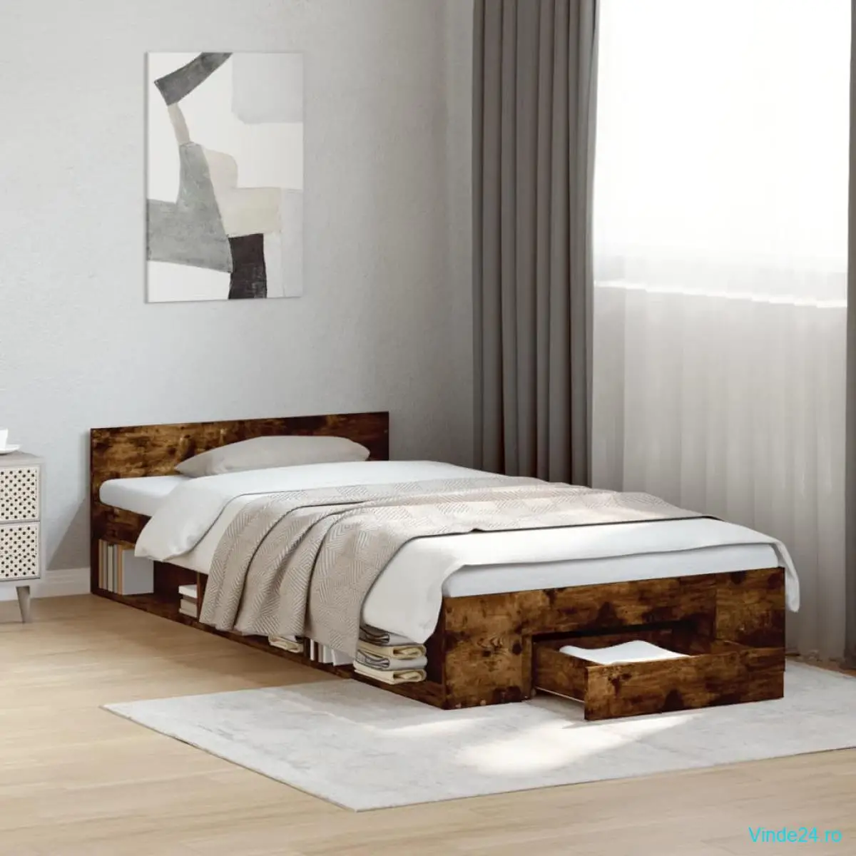 vidaXL Cadru pat cu sertar stejar fumuriu, 90x200 cm, lemn prelucrat