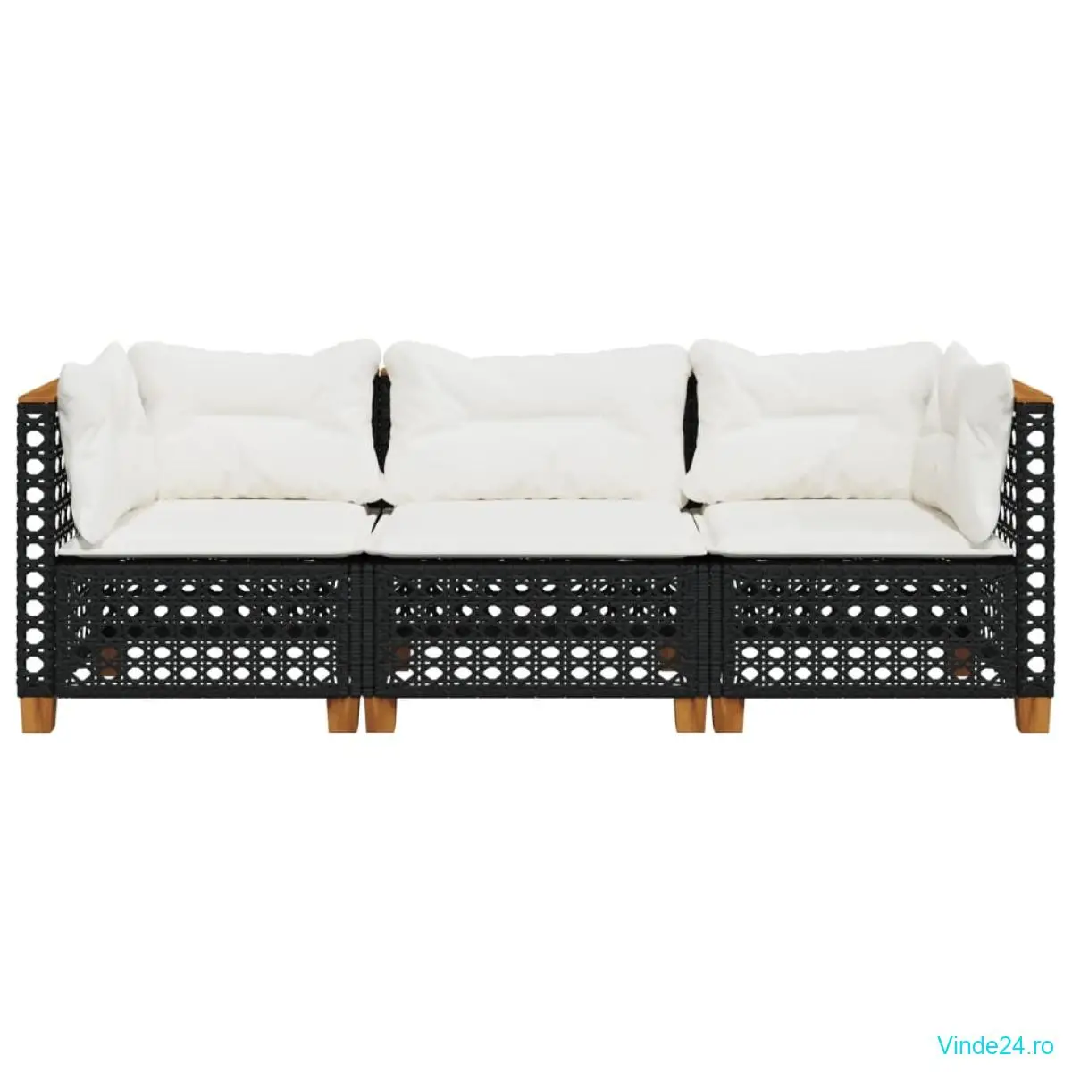 vidaXL Canapea de grădină cu perne, 3 locuri, negru, poliratan