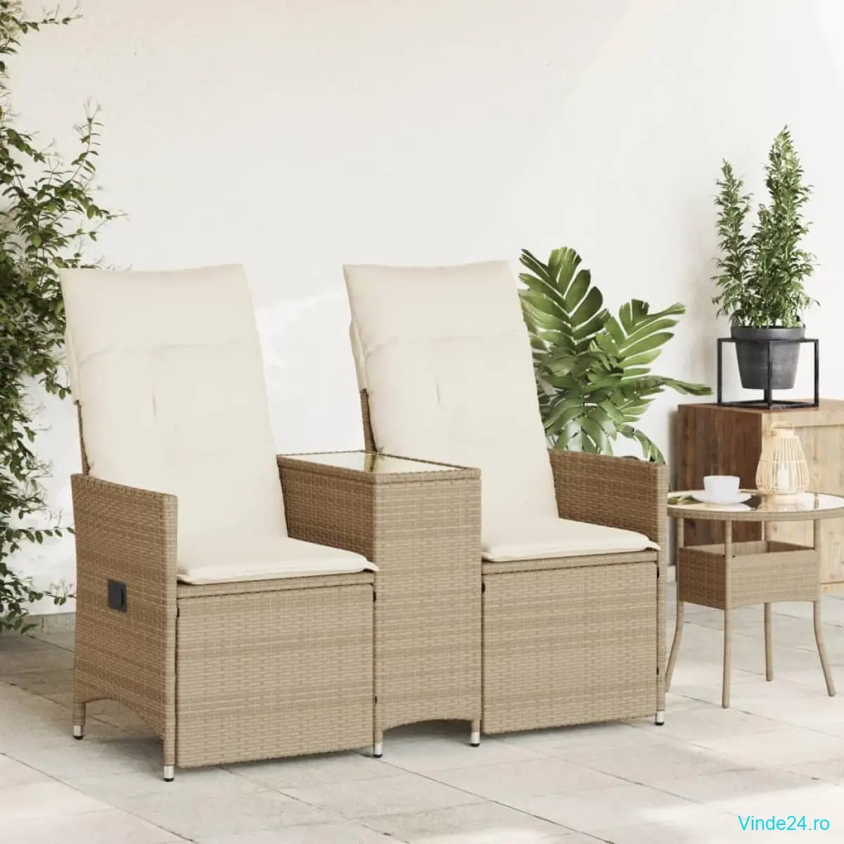 vidaXL Canapea de grădină rabatabilă 2 locuri, cu masă, bej, poliratan