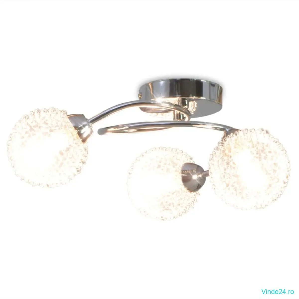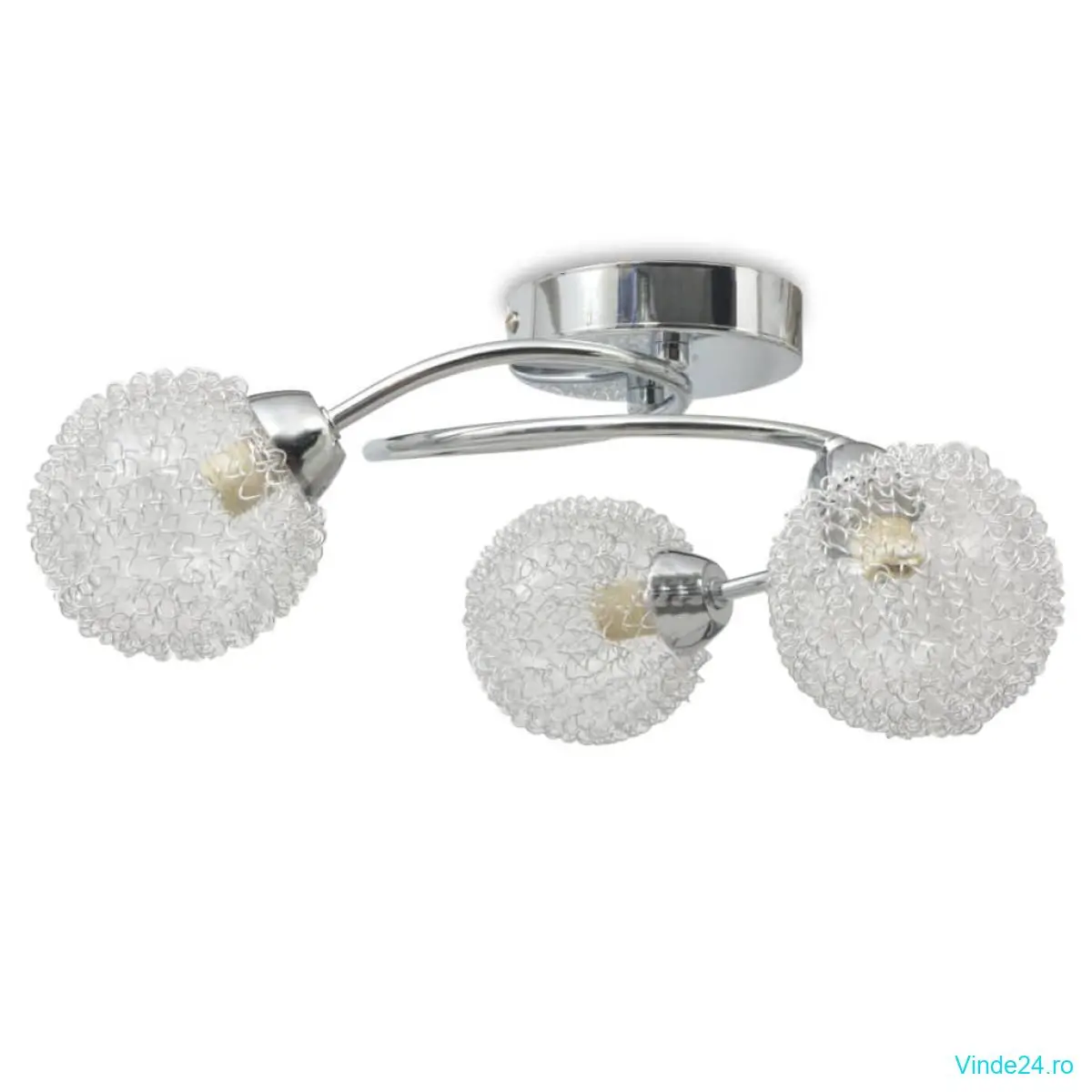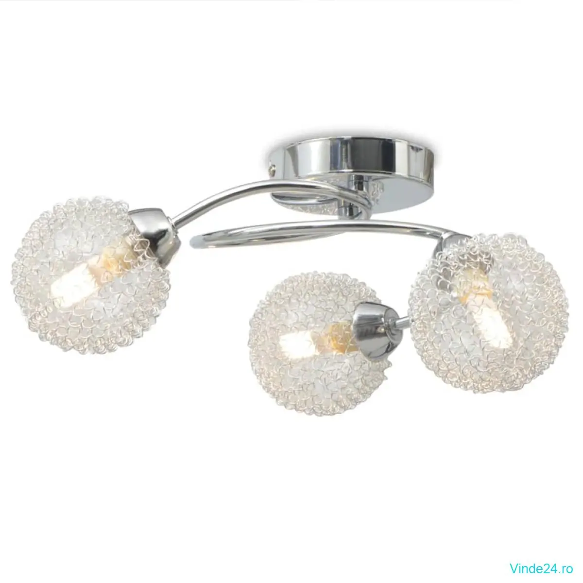 Această lustră poate fi montată cu ușurință pe orice plafon, datorită bazei metalice de calitate superioară. Brațele metalice spiralate îi dau un aspect elegant. O lumină plăcută se va filtra prin abajururile de sticlă delicate, luminând fiecare colț al camerei. Plasa lucioasă de sârmă, care decorează abajururile, reflectă lumina, amplificându-i strălucirea. Această lampă de tavan deosebită va arăta grozav în orice încăpere a casei.