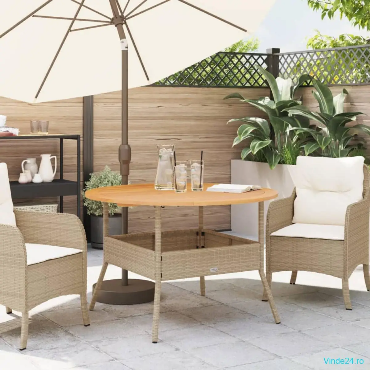 • Blat din lemn masiv: Această masă de grădină are un blat din lemn care este robust, durabil și ușor de curățat cu o cârpă umedă.