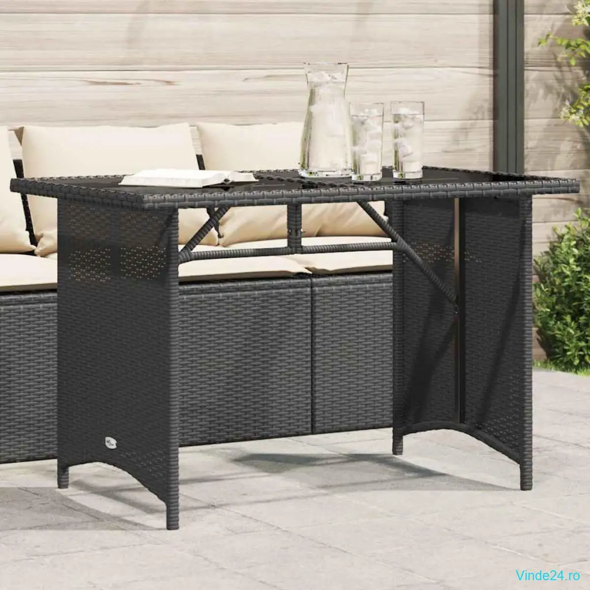 vidaXL Masă grădină cu blat din sticlă, negru, 110x68x70 cm, poliratan