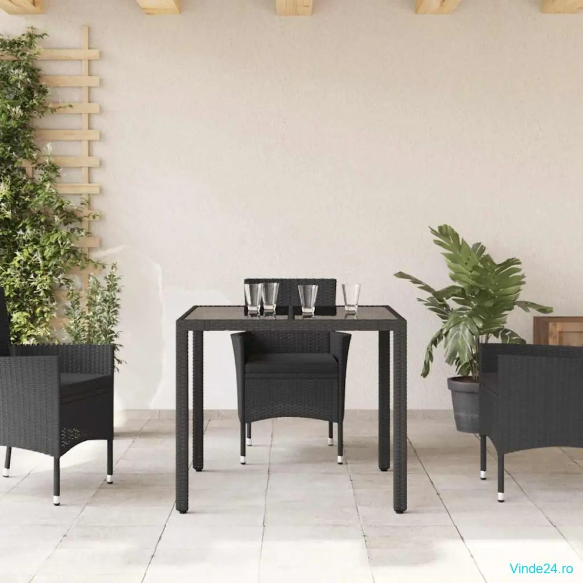 vidaXL Masă grădină cu blat din sticlă, negru, 90x90x75 cm, poliratan