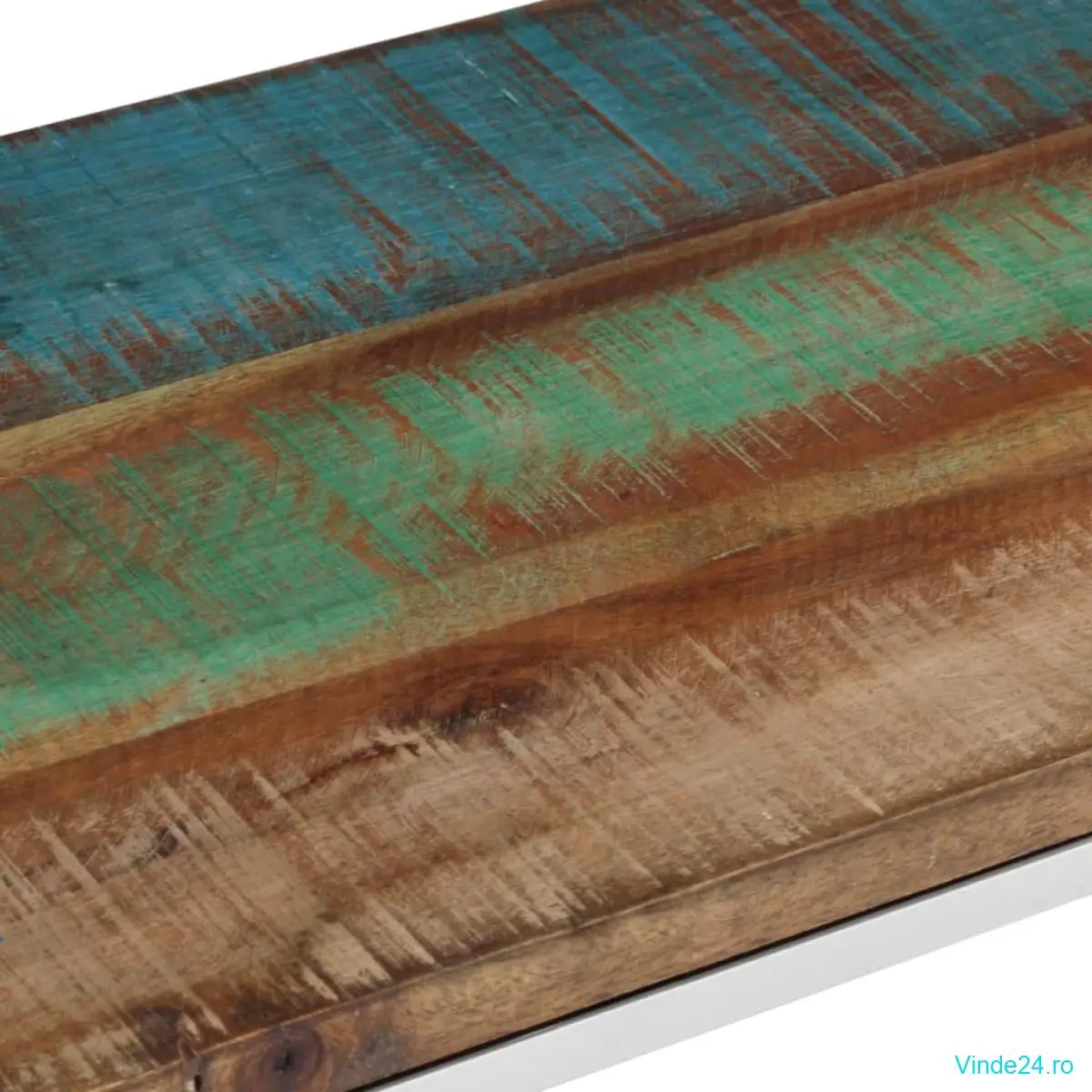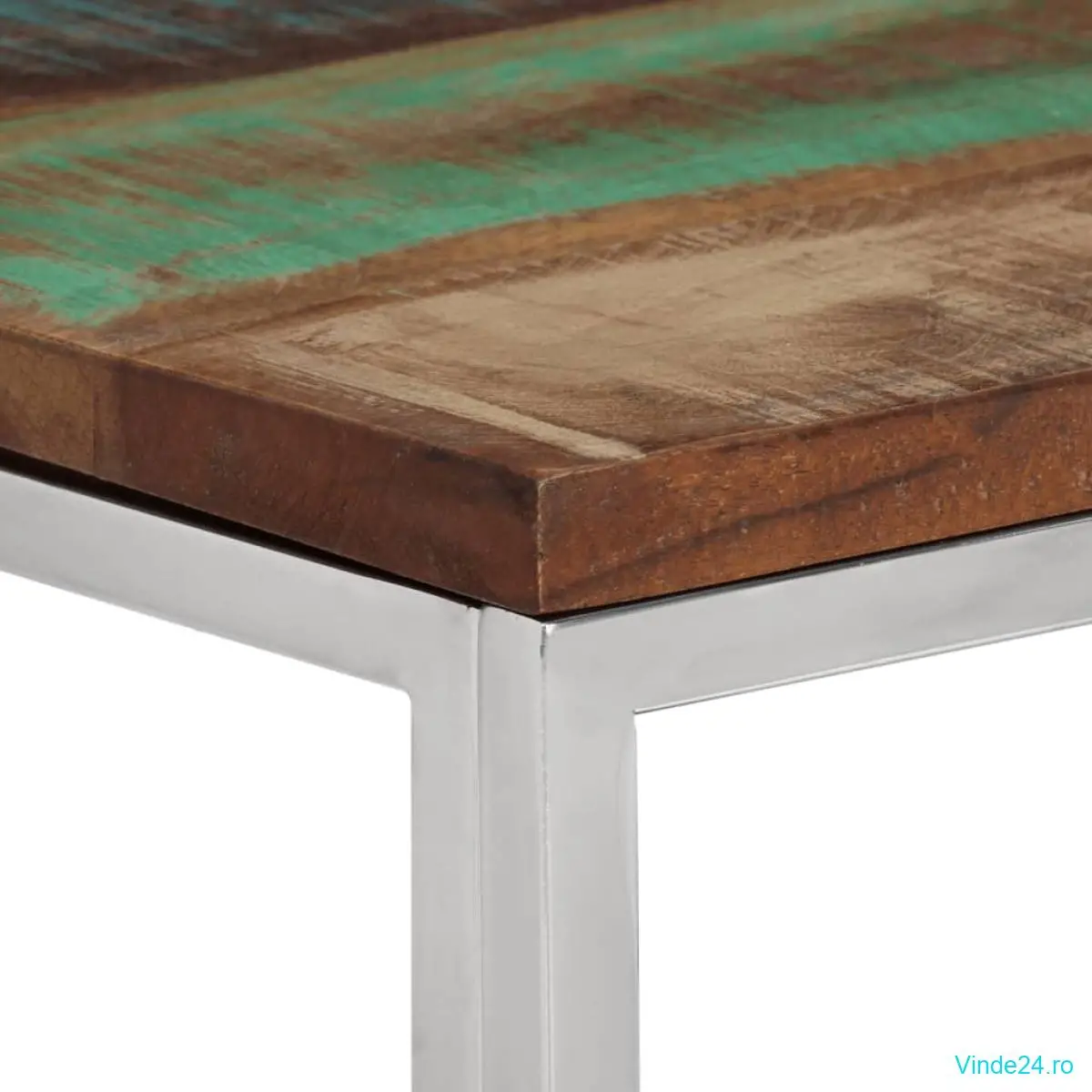 - Blat din lemn masiv recuperat: Lemnul masiv recuperat este alcătuit din cherestea reutilizată, cum ar fi lemnul de tec, lemnul de mango, lemnul de pin și fag. Aceste materiale sunt reciclate din clădiri vechi, cum ar fi fabrici, magazii și bărci. Deoarece fiecare piesă este realizată manual și culorile vor varia pentru fiecare produs. Blatul acestei mese de canapea oferă o suprafață sigură și amplă pentru a așeza vaze, plante în ghivece sau alte obiecte decorative.