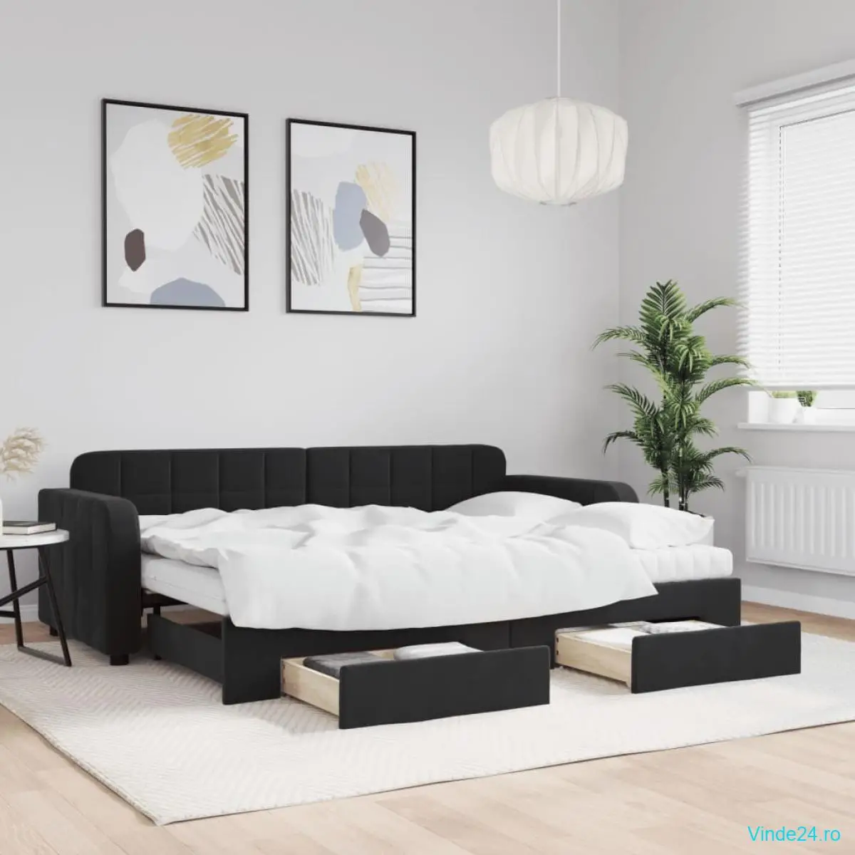 - Spațiu amplu de depozitare: Acest pat pentru oaspeți are două sertare cu roți care oferă spațiu amplu pentru depozitarea hainelor, șosetelor, jucăriilor, pernelor, etc.