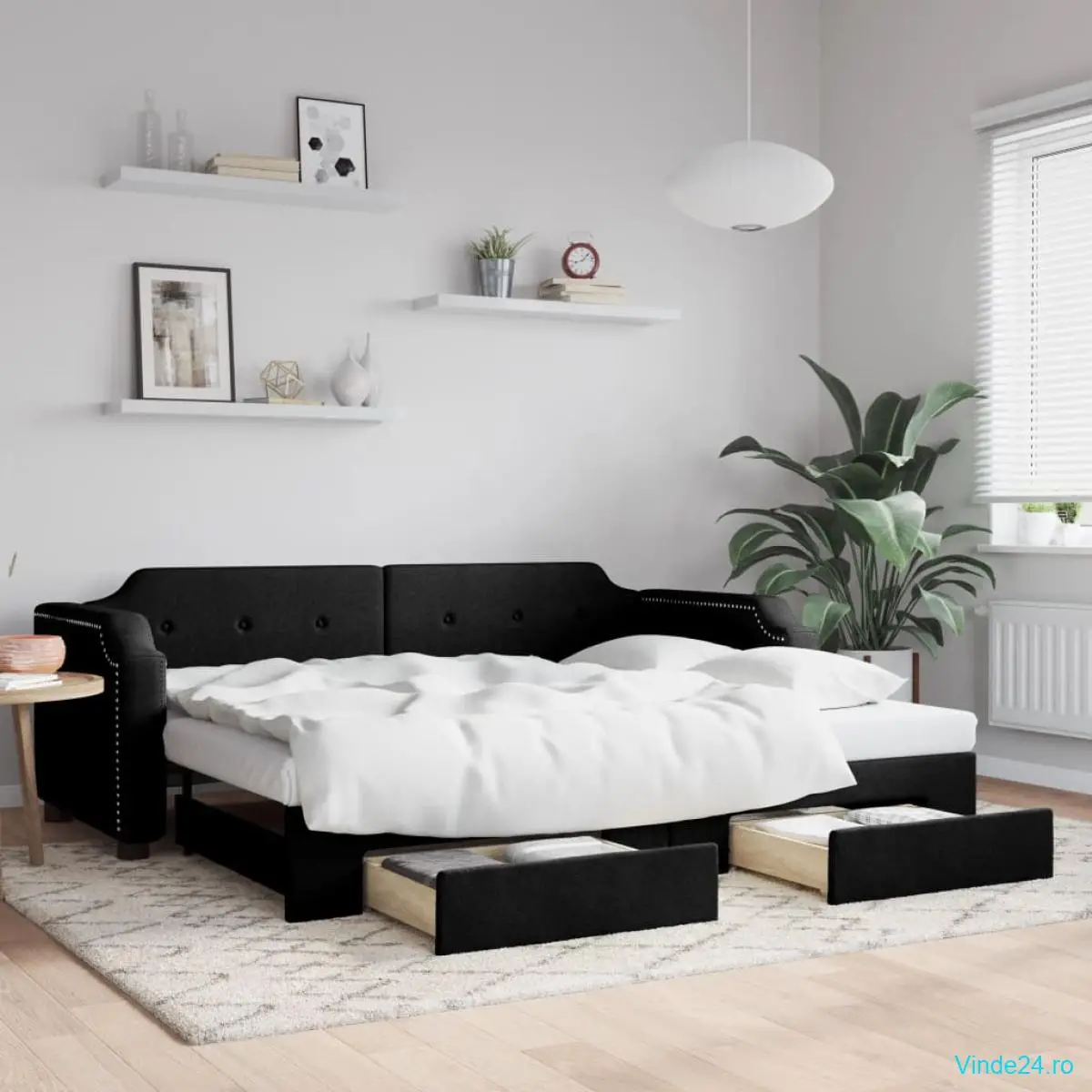 - Spațiu amplu de depozitare: Acest pat pentru oaspeți are două sertare cu roți care oferă spațiu amplu pentru depozitarea hainelor, șosetelor, jucăriilor, pernelor, etc.