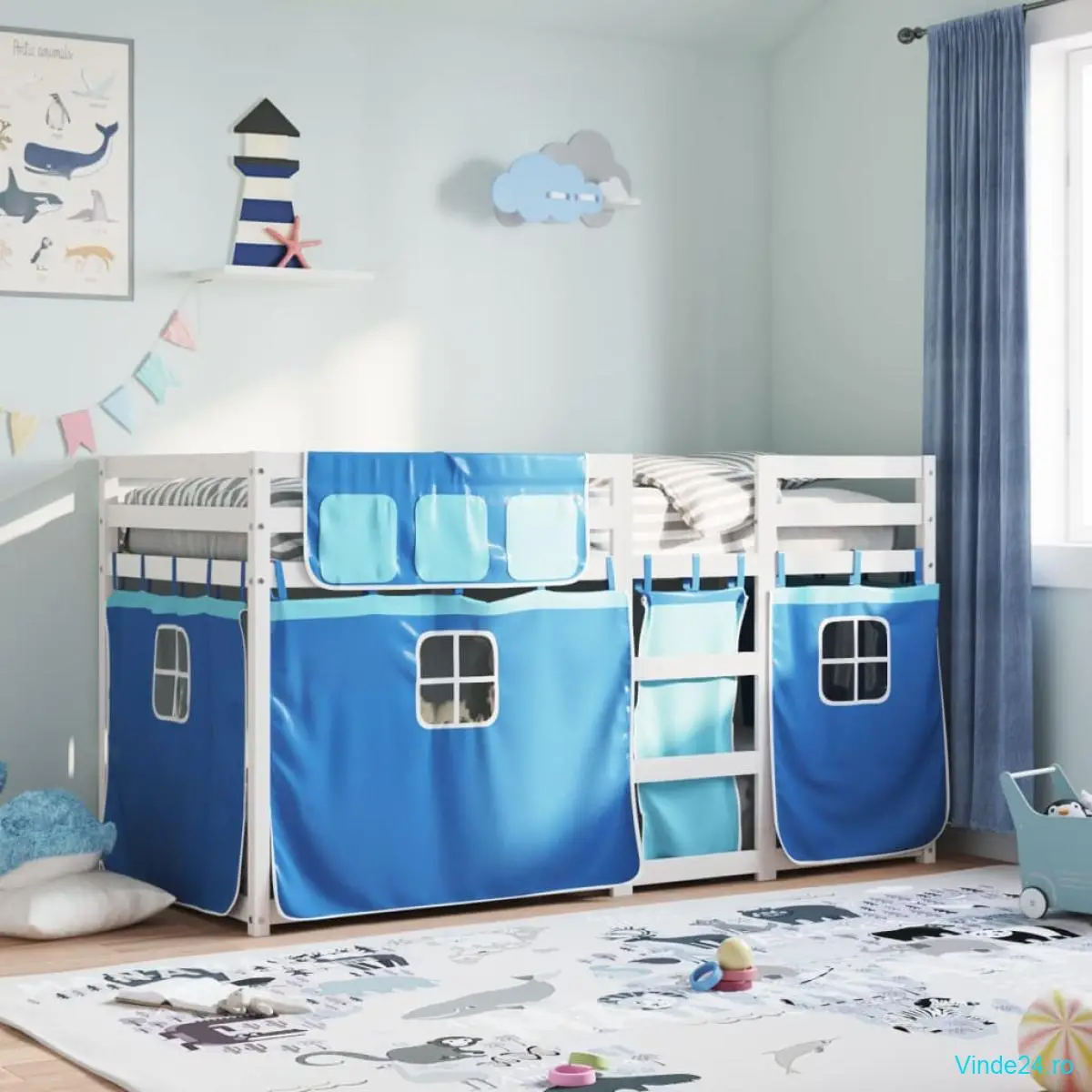 vidaXL Pat supraetajat cu perdele, albastru, 90x200 cm, lemn masiv pin
