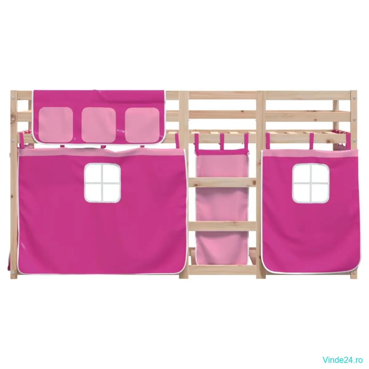 vidaXL Pat supraetajat cu perdele, roz, 90x200 cm, lemn masiv pin