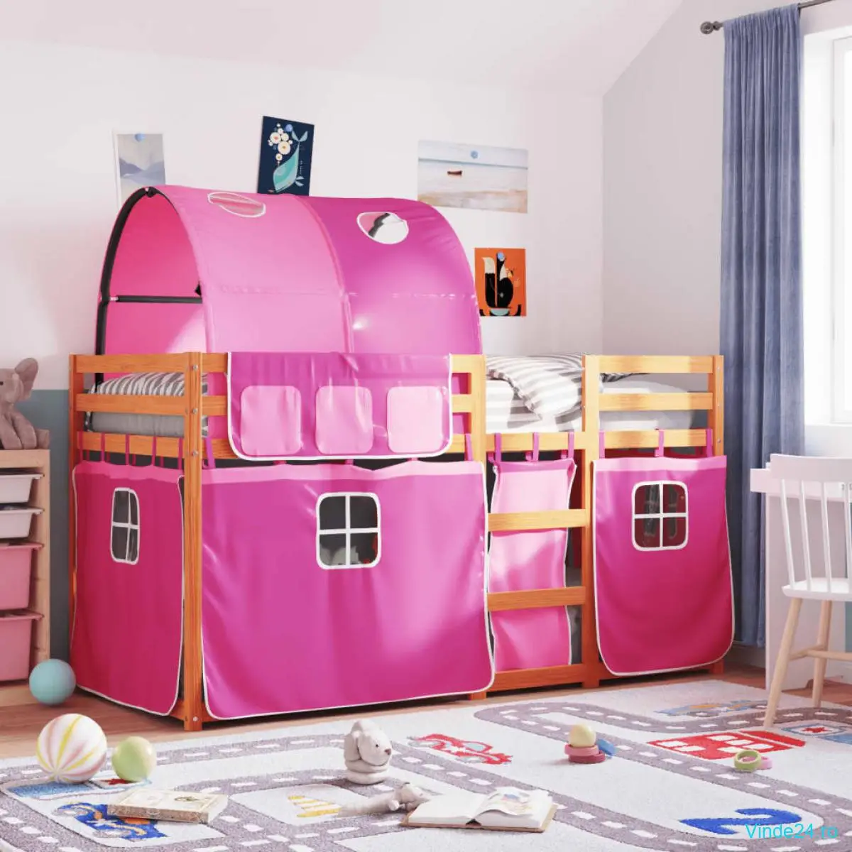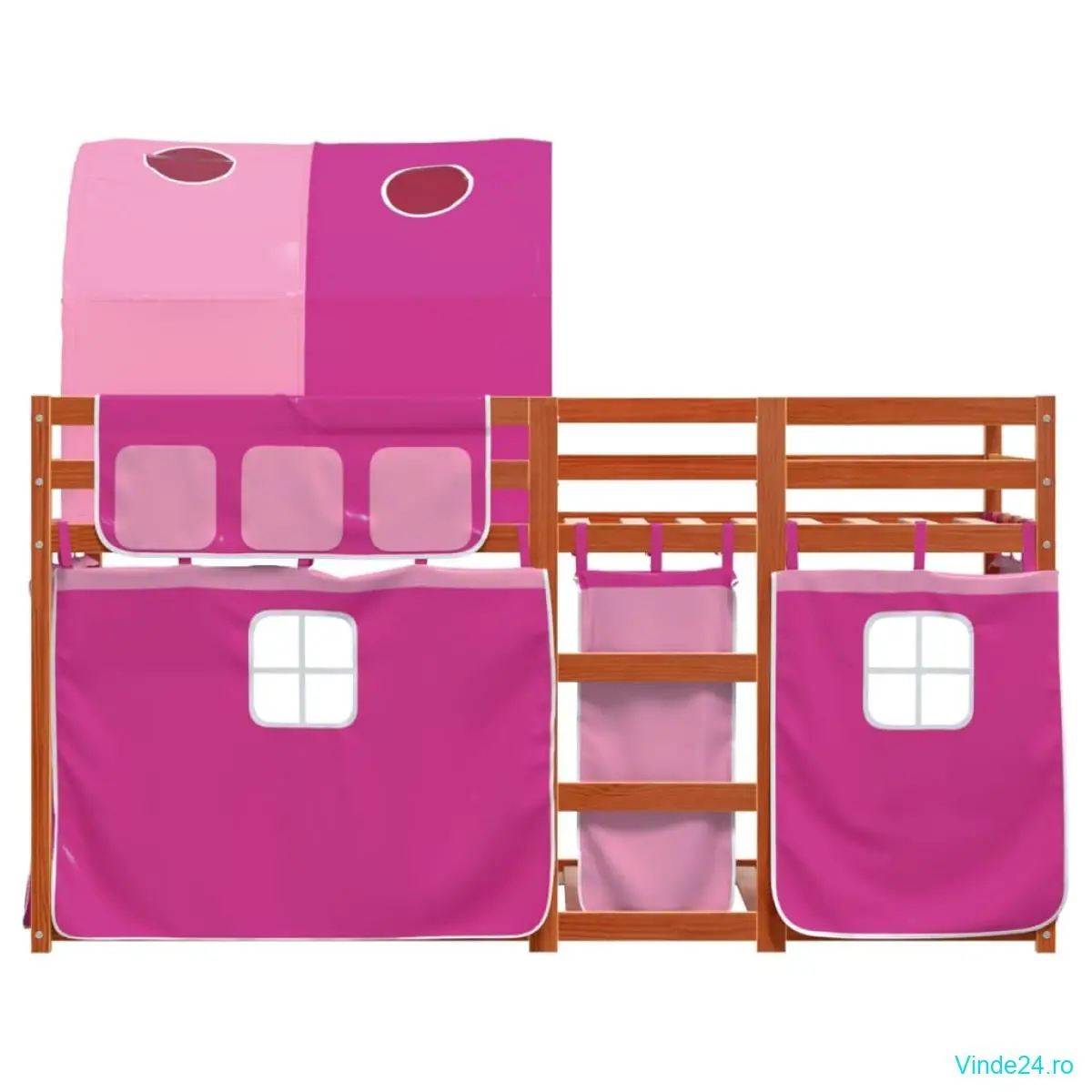 vidaXL Pat supraetajat cu perdele, roz, 90x200 cm, lemn masiv pin