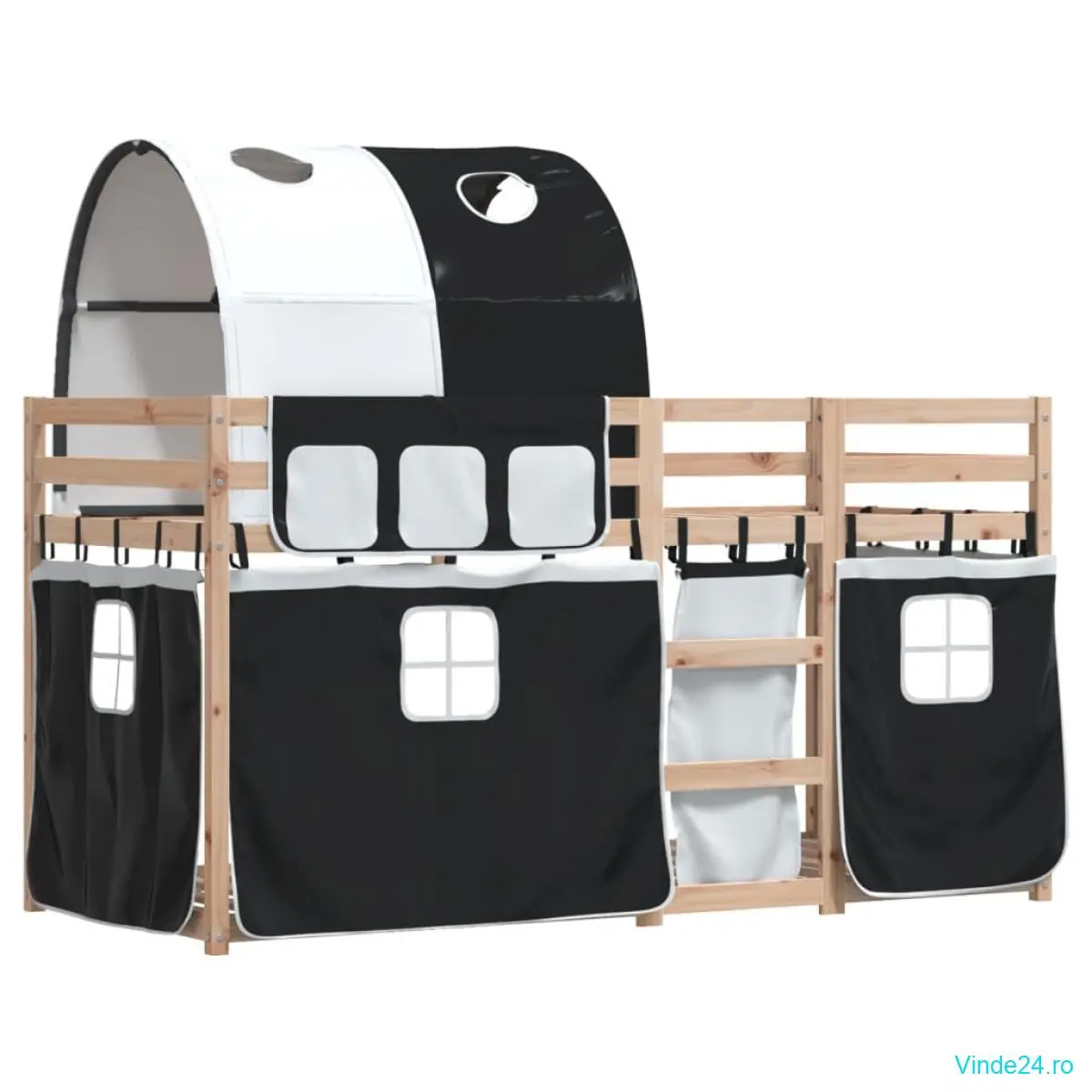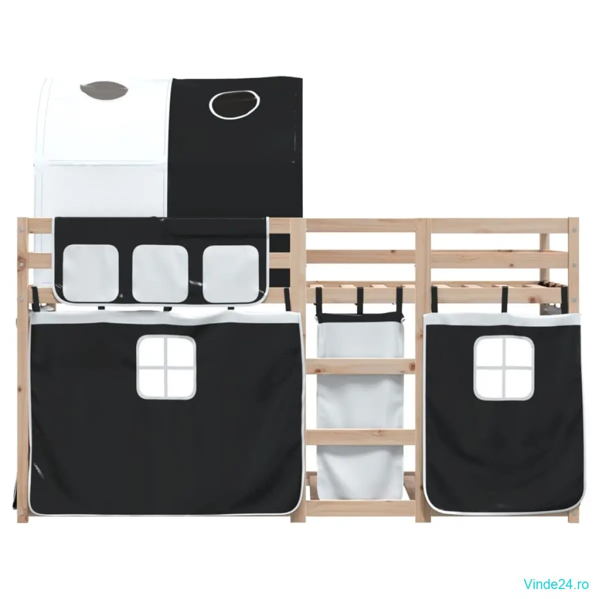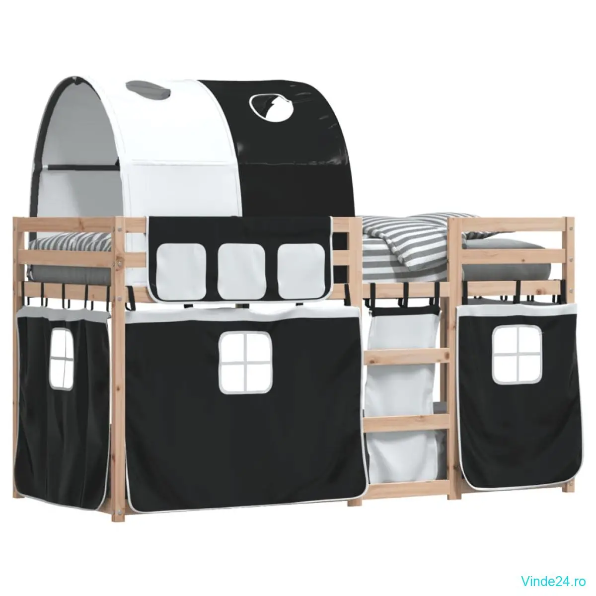 vidaXL Pat supraetajat de copii perdele, alb/negru, 90x190 cm lemn pin