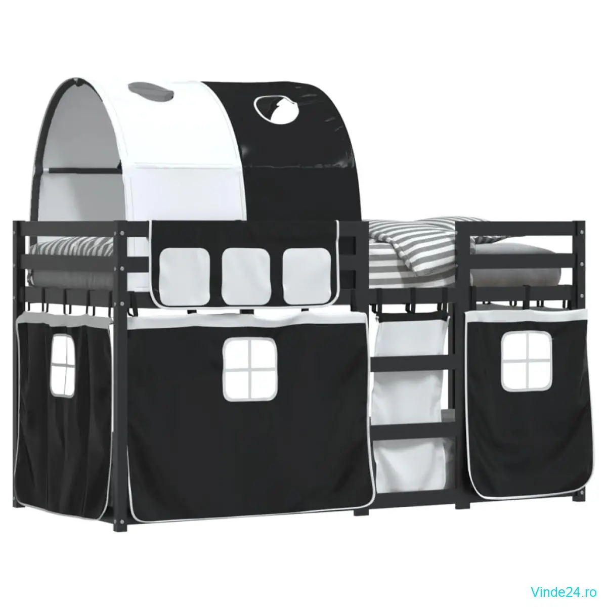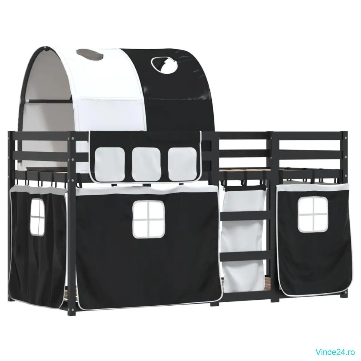 vidaXL Pat supraetajat de copii perdele, alb/negru, 90x190 cm lemn pin