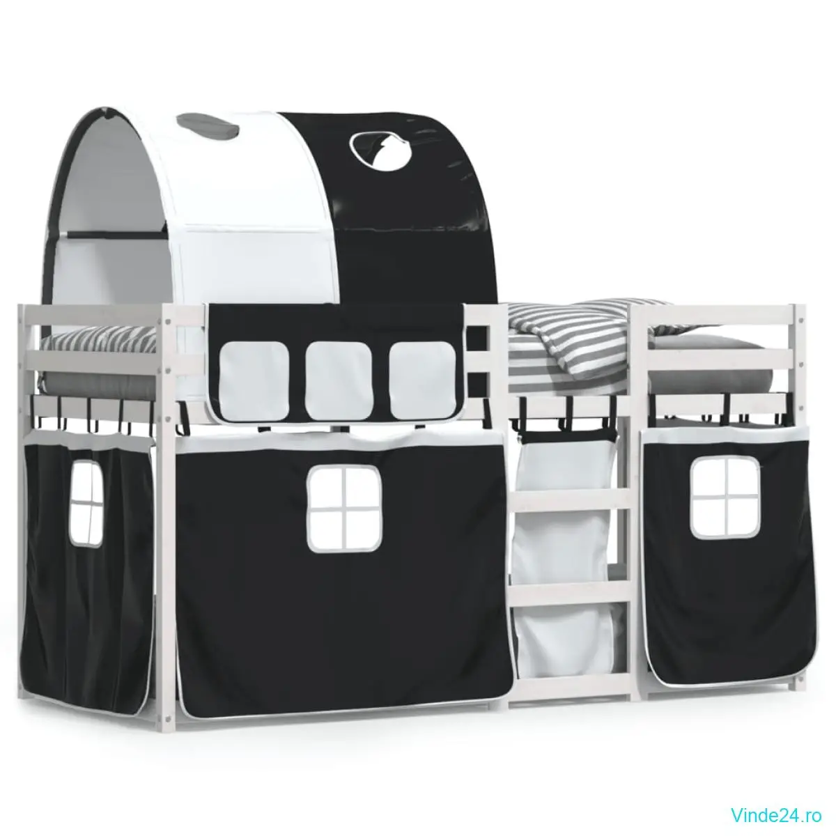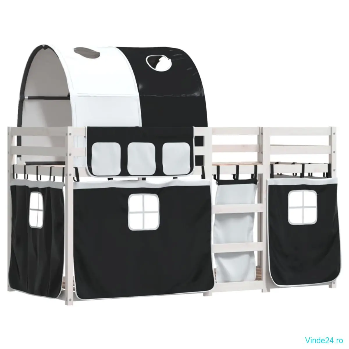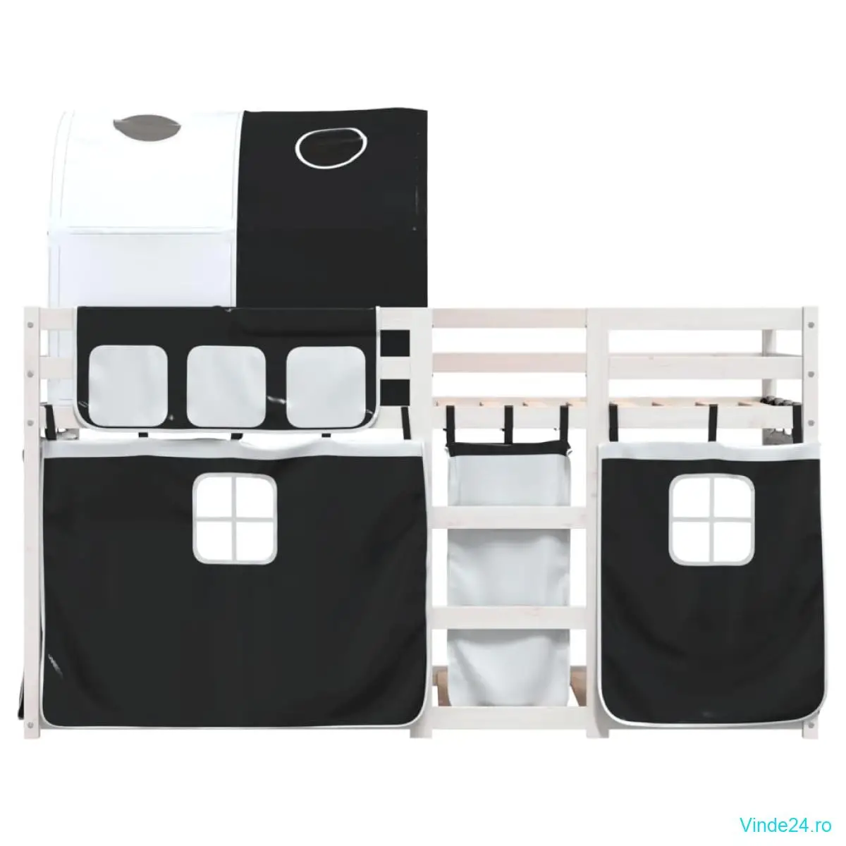 vidaXL Pat supraetajat de copii perdele, alb/negru, 90x200 cm lemn pin