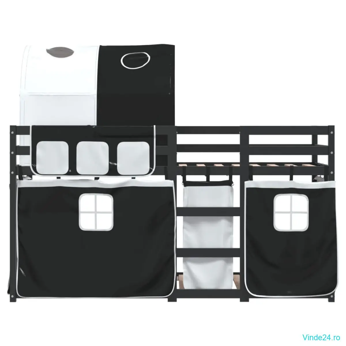 vidaXL Pat supraetajat de copii perdele, alb/negru, 90x200 cm lemn pin