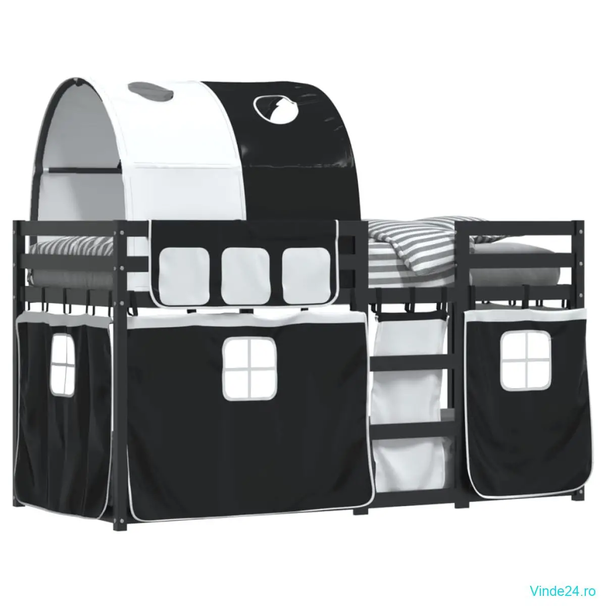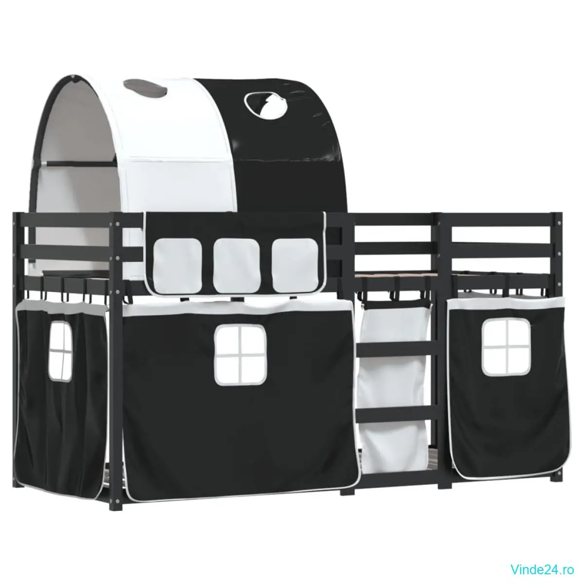 vidaXL Pat supraetajat de copii perdele, alb/negru, 90x200 cm lemn pin