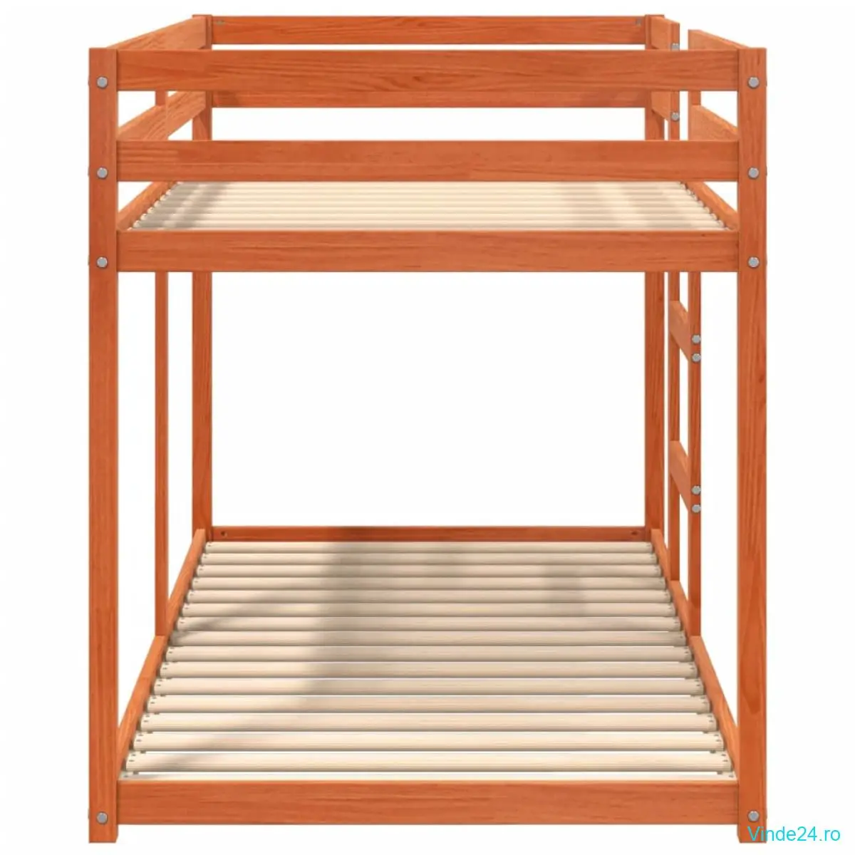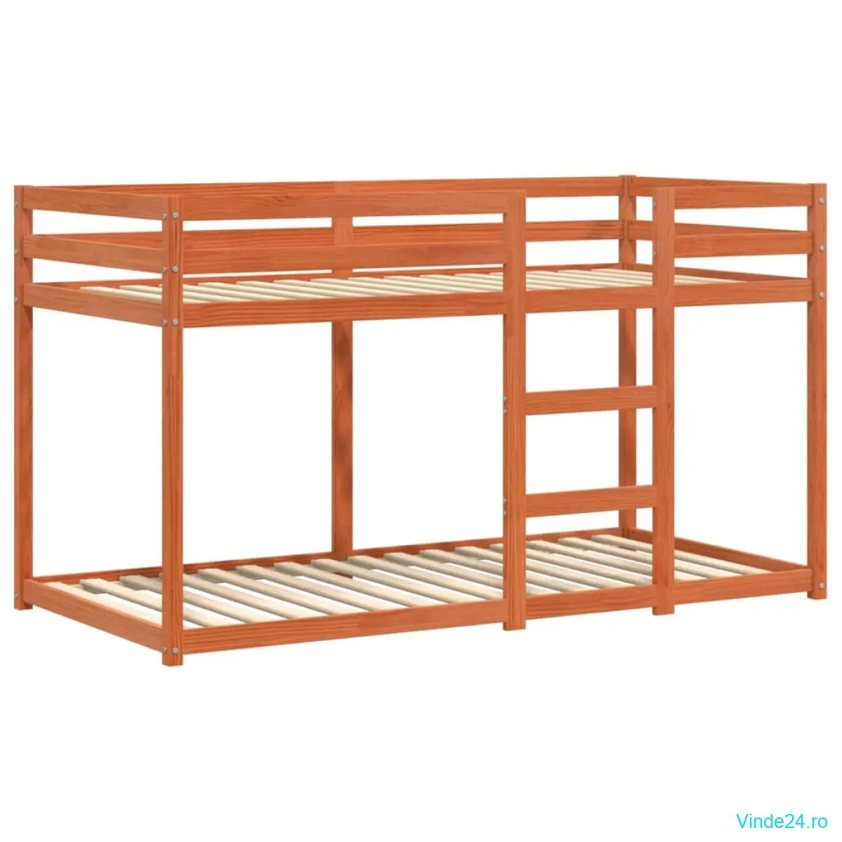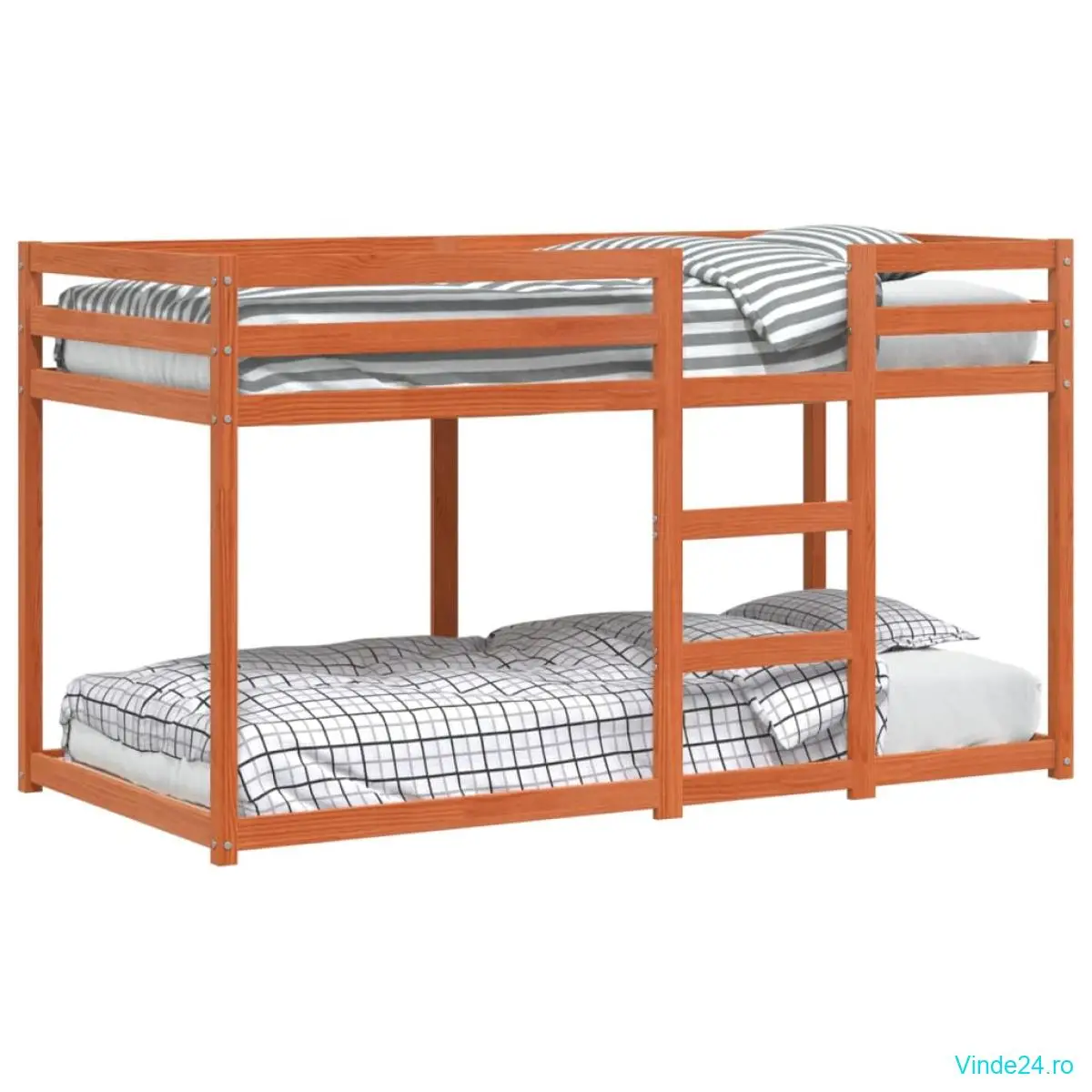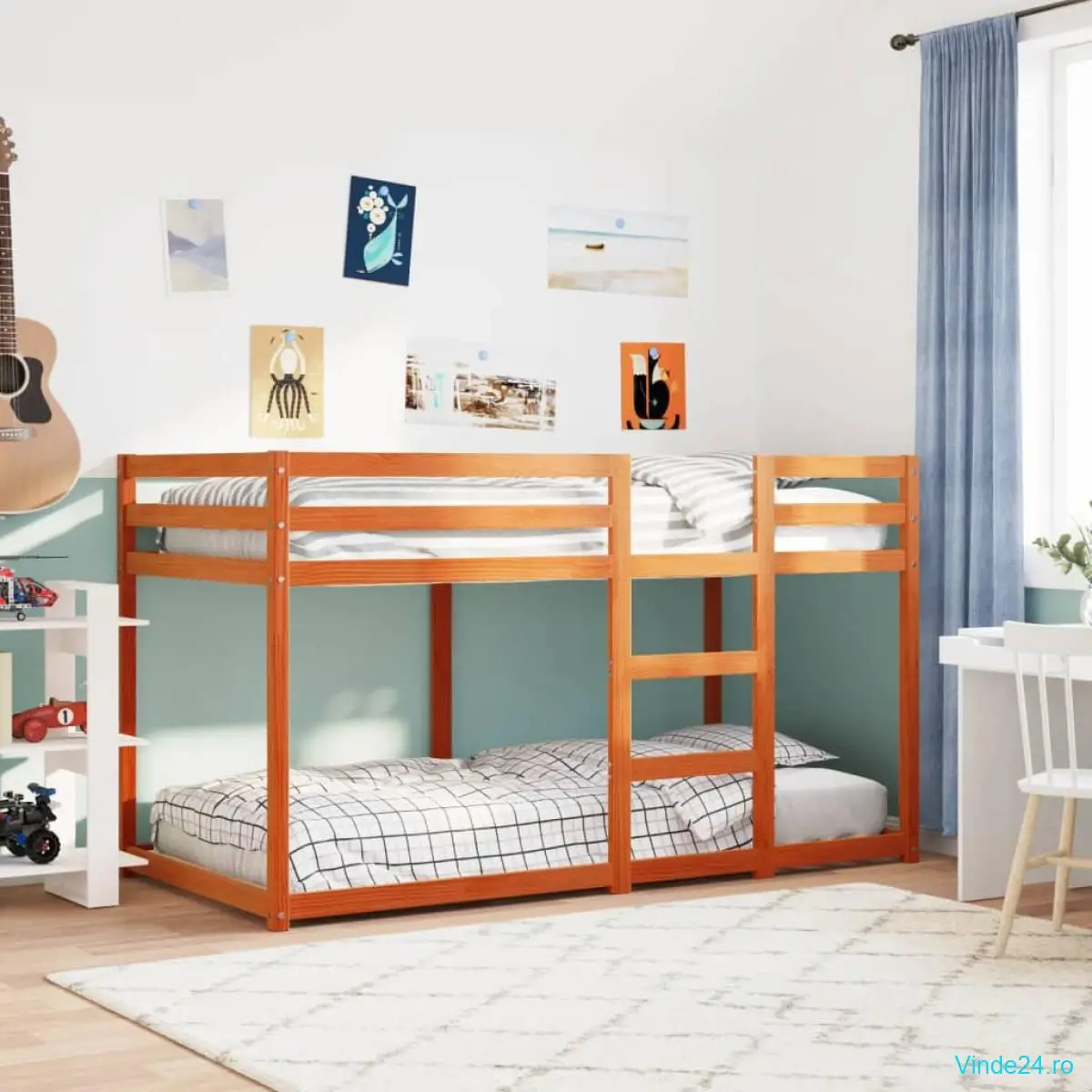 Acest pat supraetajat din lemn este elegant și funcțional, fiind un plus perfect pentru orice cameră cu spațiu limitat.