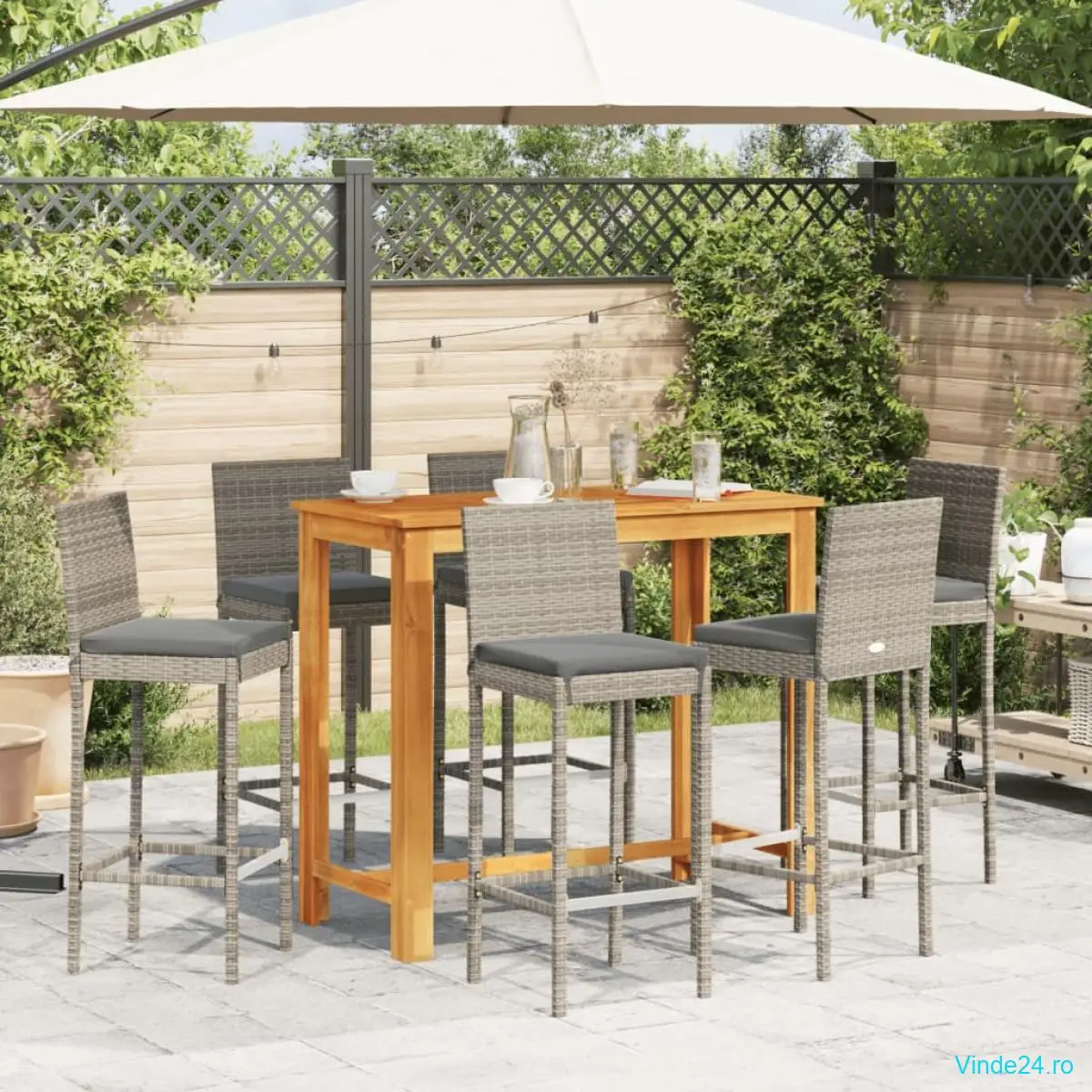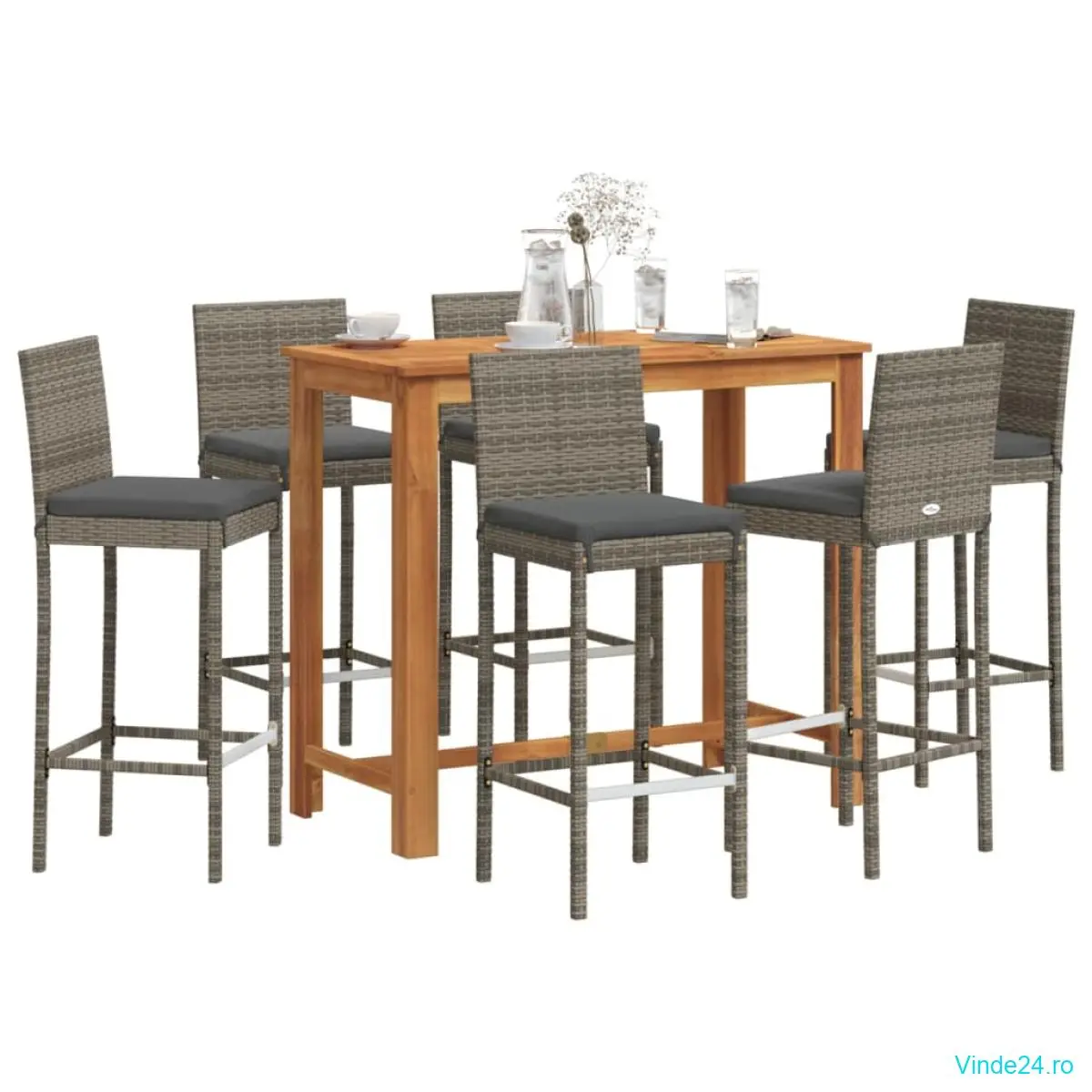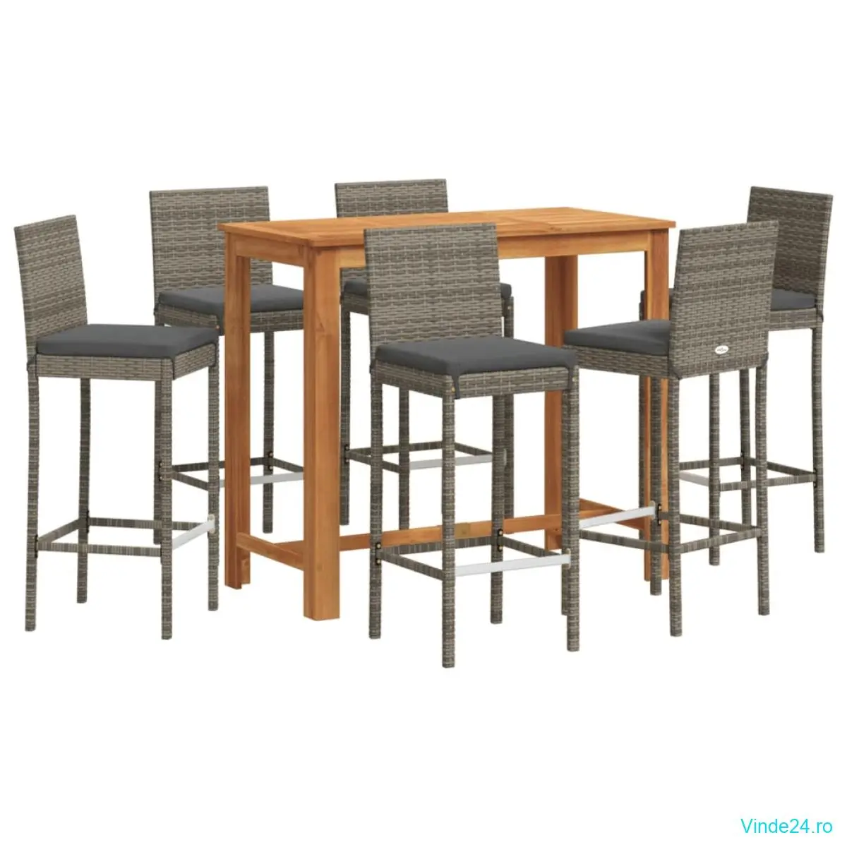 vidaXL Set bar de grădină, 7 piese, gri, lemn masiv acacia/ poliratan
