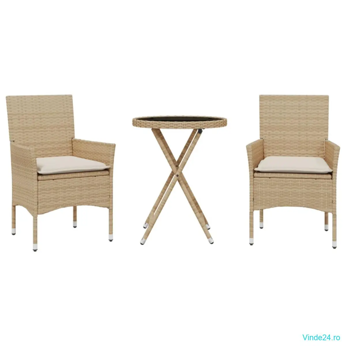 vidaXL Set bistro cu perne, 3 piese, bej, poliratan și sticlă